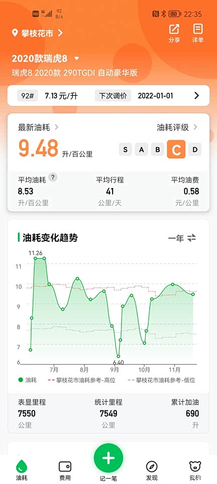 高速6个,国道7.5,市区10到不封上线,主要看均速,这车在市区跟所有SUV一样,都不省油,综合路况在8.5左右,相对省油,如果不跑高速,那综合油耗在9个多,咋说呢,在国产里面还是比较省油的,跟crv还是有差距的,表显没有参考价值