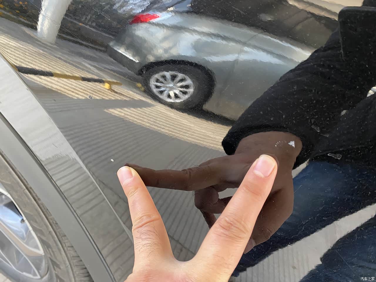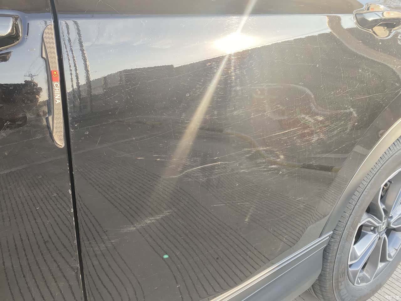 车漆是真的薄,被树枝划的到处都是划痕,已经有好几个地方被石子撞掉漆了。