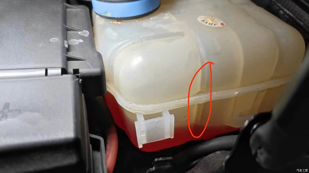 车子停在家里,发现地上有一摊是水印,打开引擎盖就发现冷却液没多少了,硬着头皮把车开到了修理店。仔细一看是冷却液水壶上有裂痕了。还是车龄大了,好多塑料件都老化了。