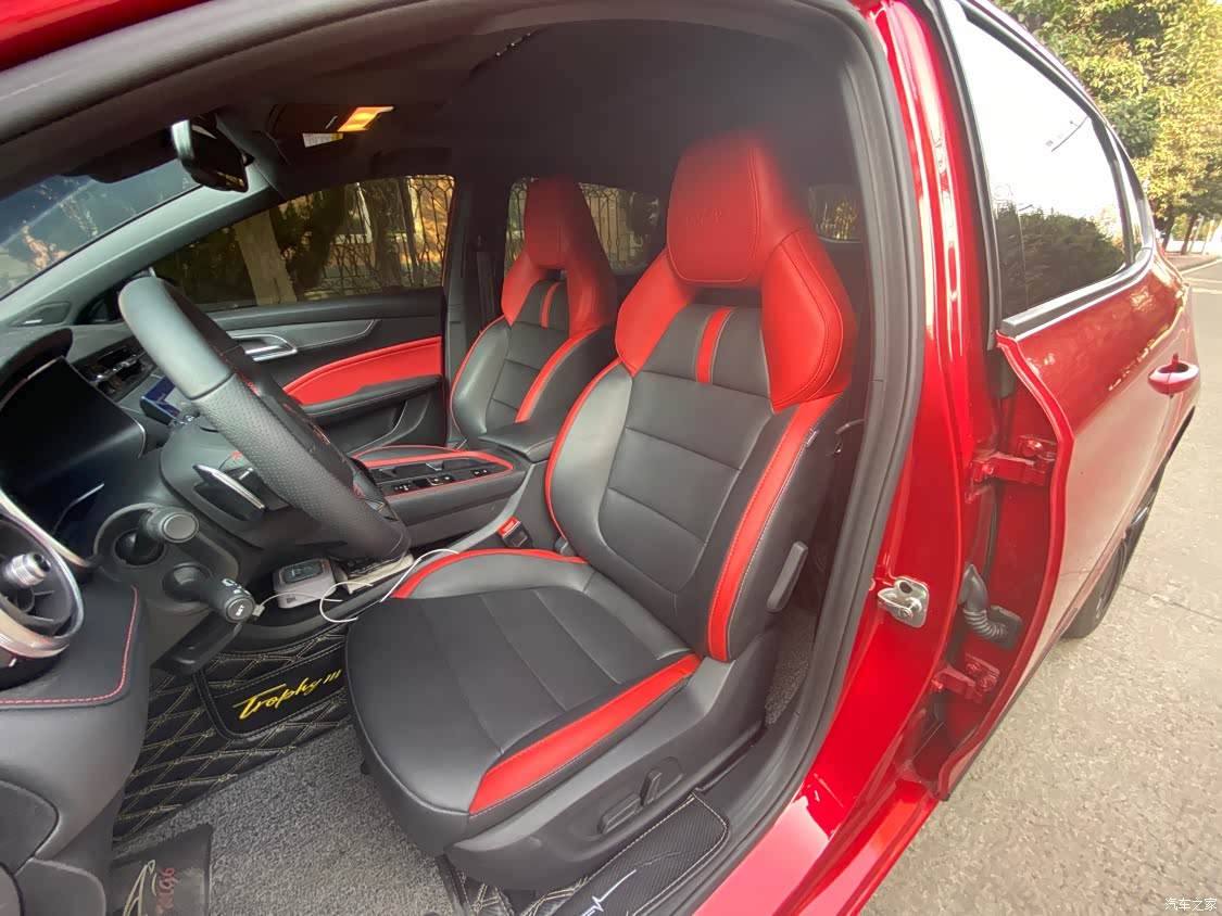 名爵6的内饰设计还算不错,黑色的主色调搭配红色 的点缀,整体看起来够运动,中控仪表台是一块超大的led液晶屏,看着酷酷的,中控还有块10.2英寸的屏幕,搭配斑马智能系统,真心感觉好用,语音控制功能,解放了双手,音响是用的bose的,音质真给力,听着非常的棒,仪表台采用了大面积皮质包裹,看着还是很高端的。