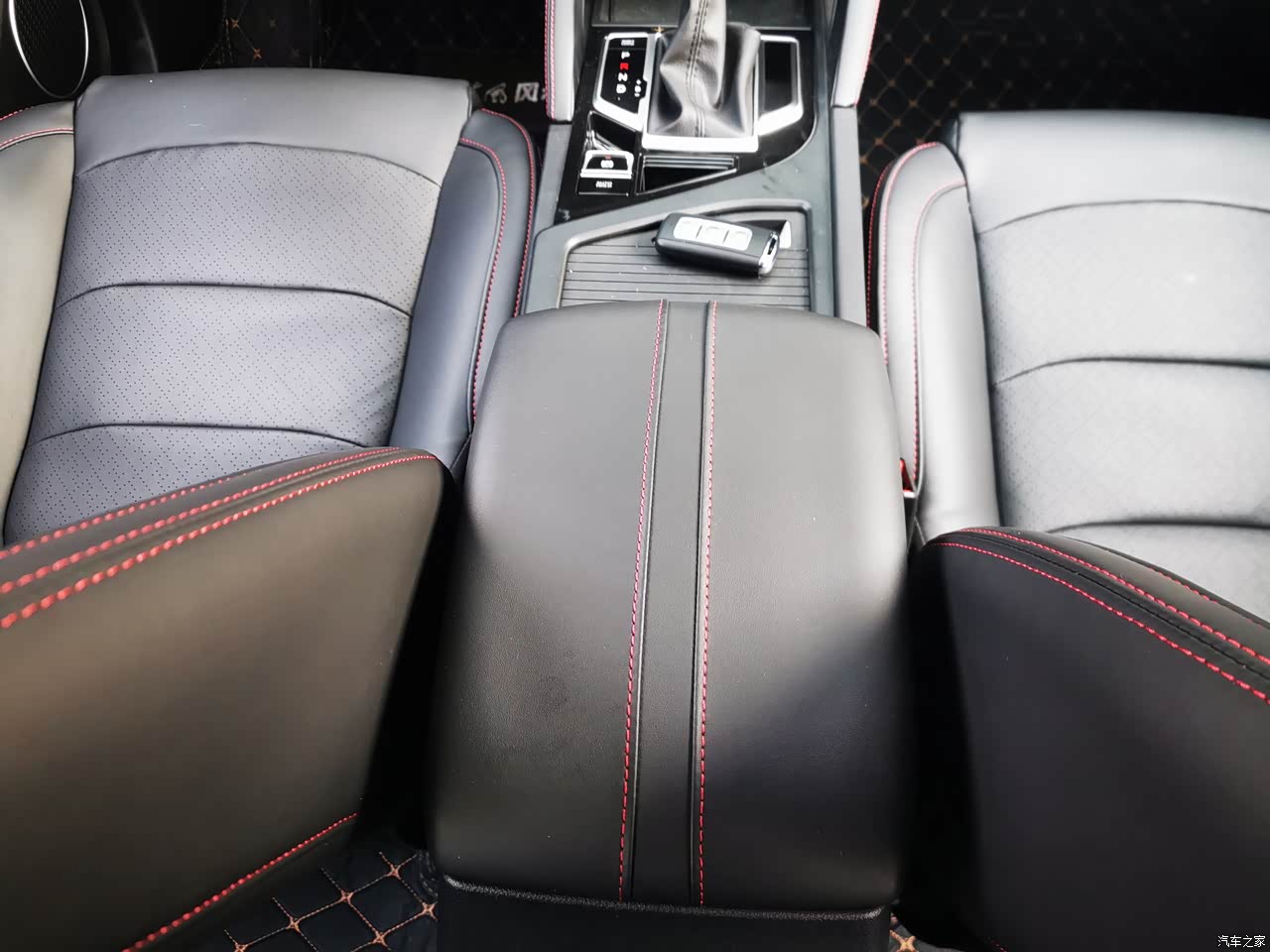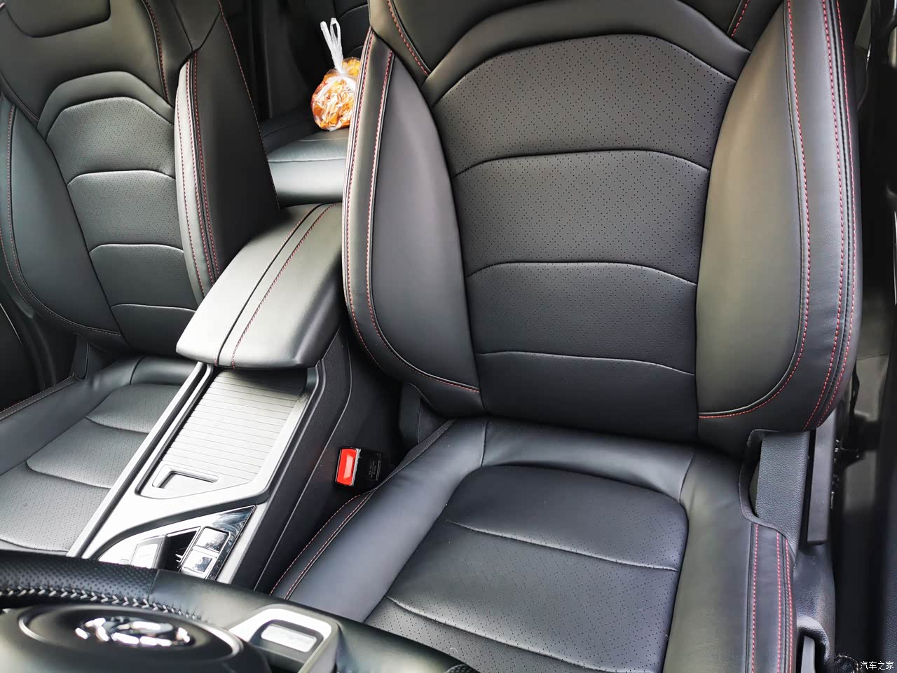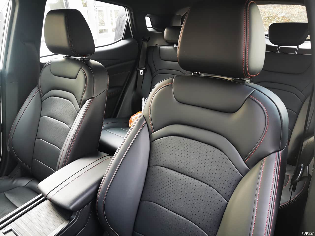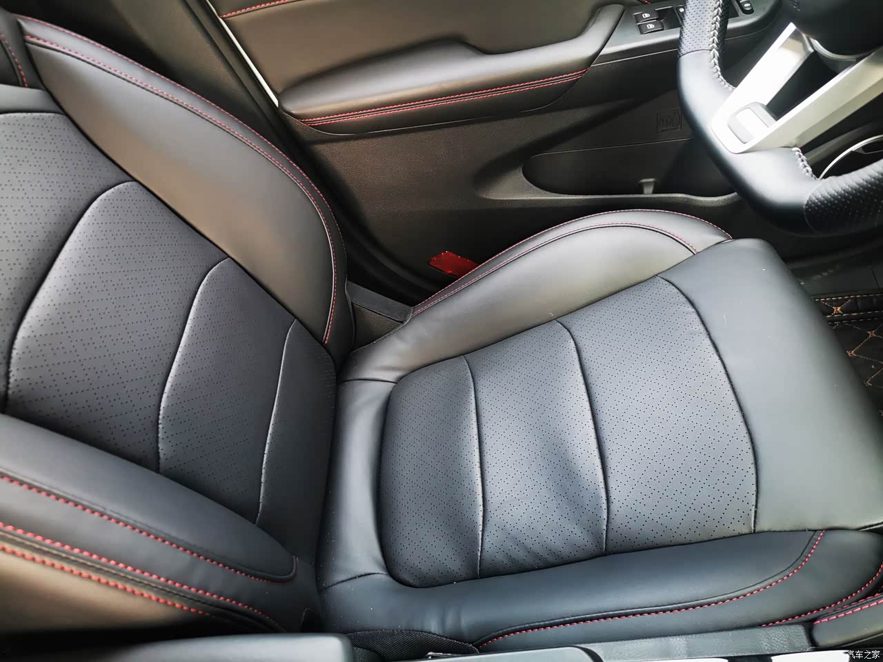 内饰的做工和用料的很不错,中控台采用了搪塑工艺,不是那种硬塑料,方向盘、门板、中控、扶手箱触手可碰的地方全是皮质包裹,感觉档次一下就上去了。黑色的皮质座椅,采用了红色的缝线,红色的缝线让这款车没有这么的沉重,多了一丝灵动。