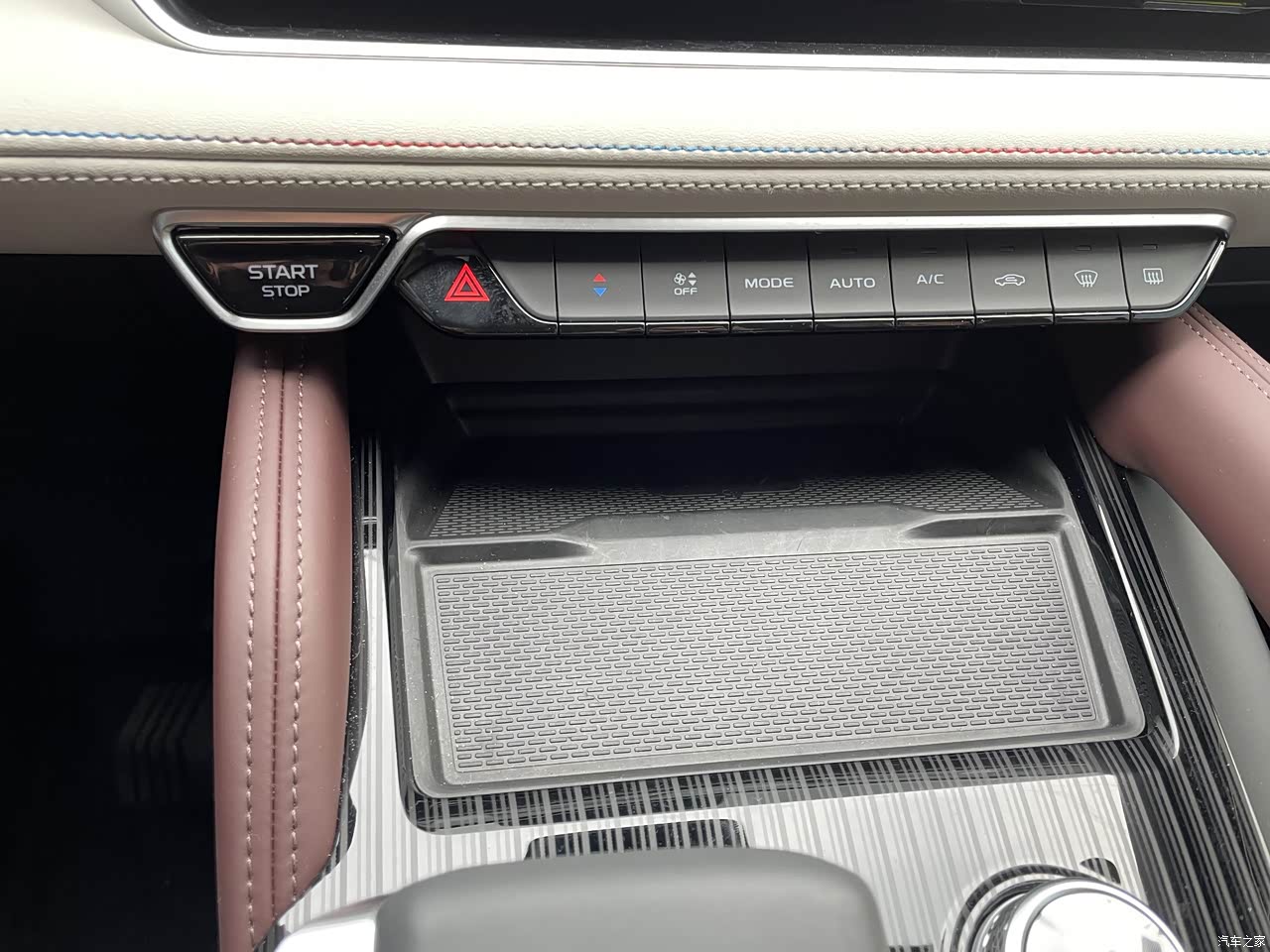 档把下面也给了个储物空间,而且12V电源接口和USB接口都有,用起来很方便,门上的储物槽有个小隔断,放瓶装水都比较稳当,放手机的地方斜下去的地方是无线充电区,不充电的话可以放在平的那一个上,只要不是太大的手机都没问题