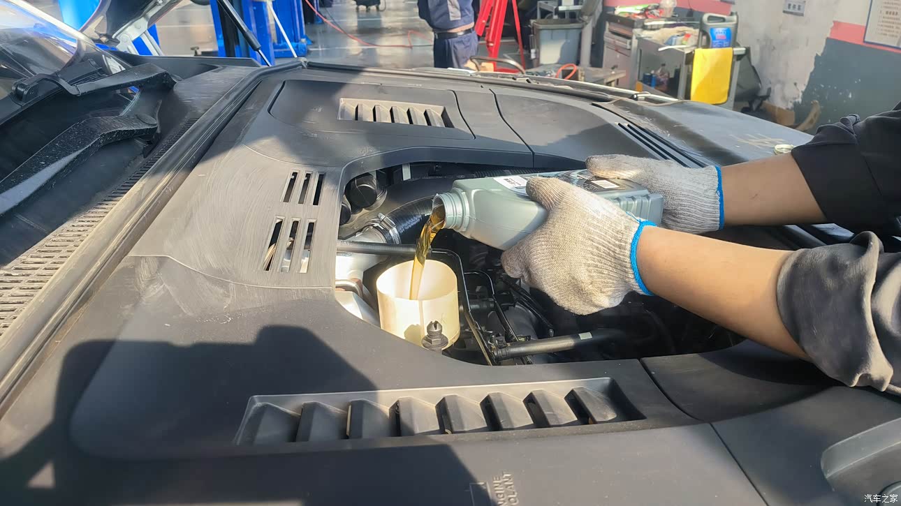师傅非常的专业换机油用漏斗一点都不会撒的到处都是