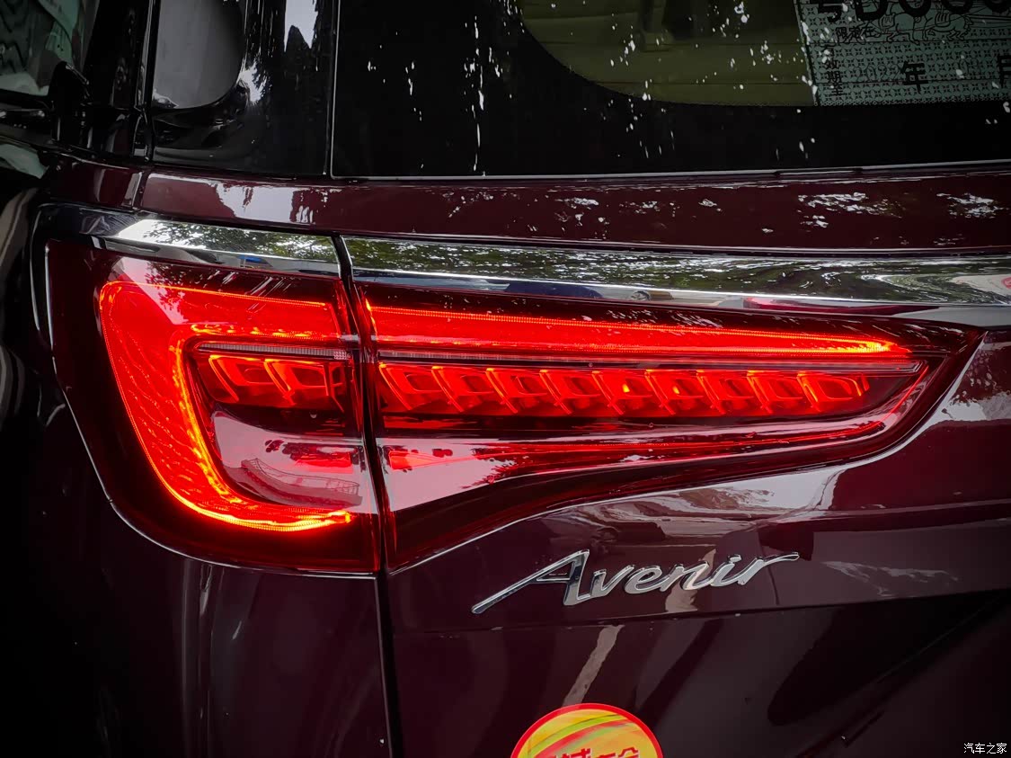 这款车的外观我觉得特别漂亮,Avenir专属的锁子甲中网看起来很豪华,特别是大灯的造型,8颗像钻石一样的灯珠点亮的时候亮晶晶的,特别有高级感,还有倒勾式的日间行车灯很有辨识度,这8颗晶钻大灯还有迎宾光效,每次解锁车子都会闪烁,特别漂亮。后尾灯的设计同样也不例外,贯穿车位的镀铬条延伸至尾灯两侧,尾灯内也有鳞片一样的造型,加上倒勾式的位置灯给车尾增添了些许威严。
