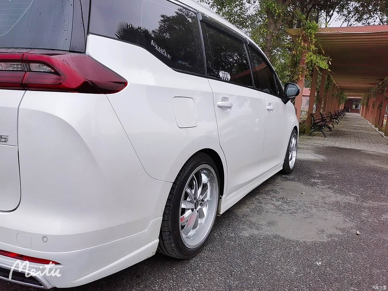 原车外观较之前有所提升,但侧面线条及尾部饱满度不够。所以自己动手加了侧裙及后裙,加大的后尾翼。针对侧向支撑力不够的情况,升级了博得全段可调悬挂,换了19寸大脚。车顶行李架安装到位。
