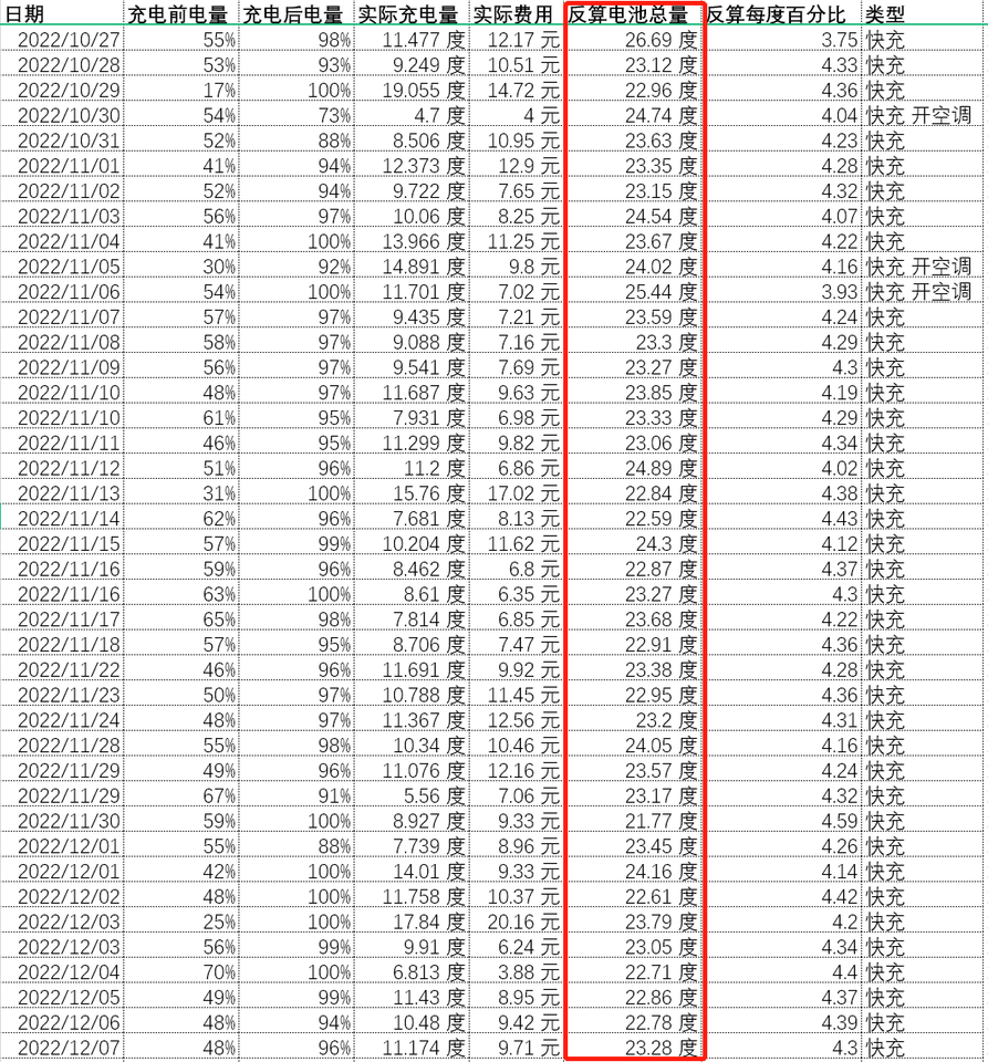 反算的电量跟实际电量不准,只是作为参考,通过长期跟踪统计,基本上徘徊在23度电左右,电池健康