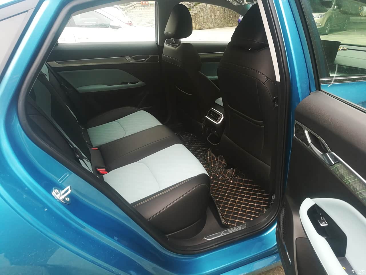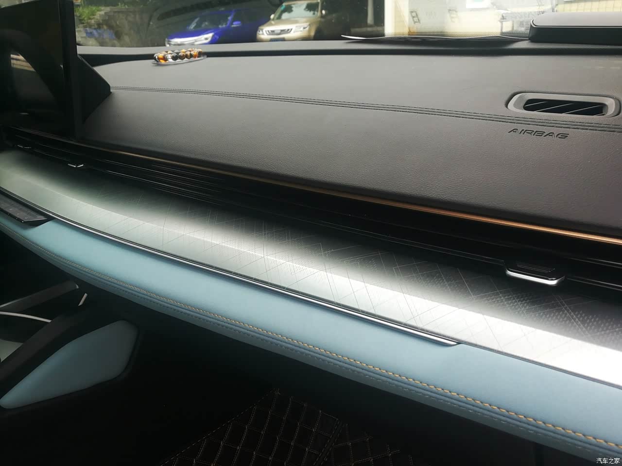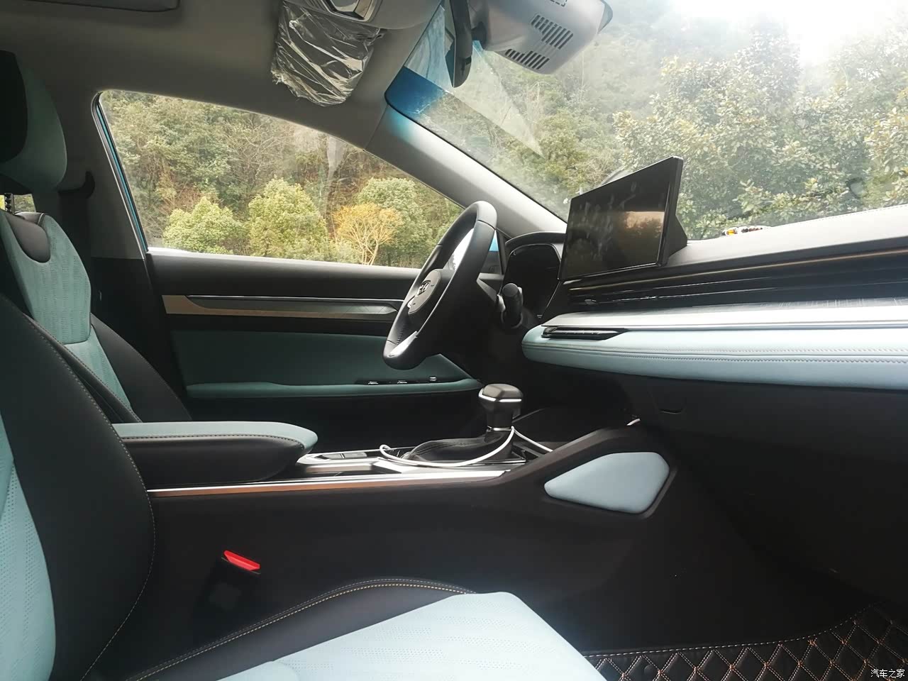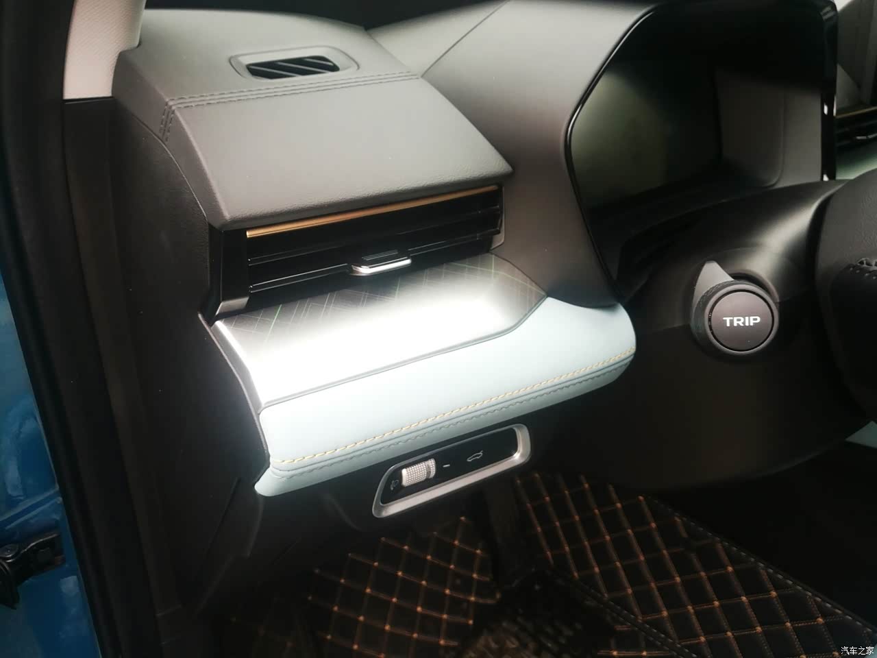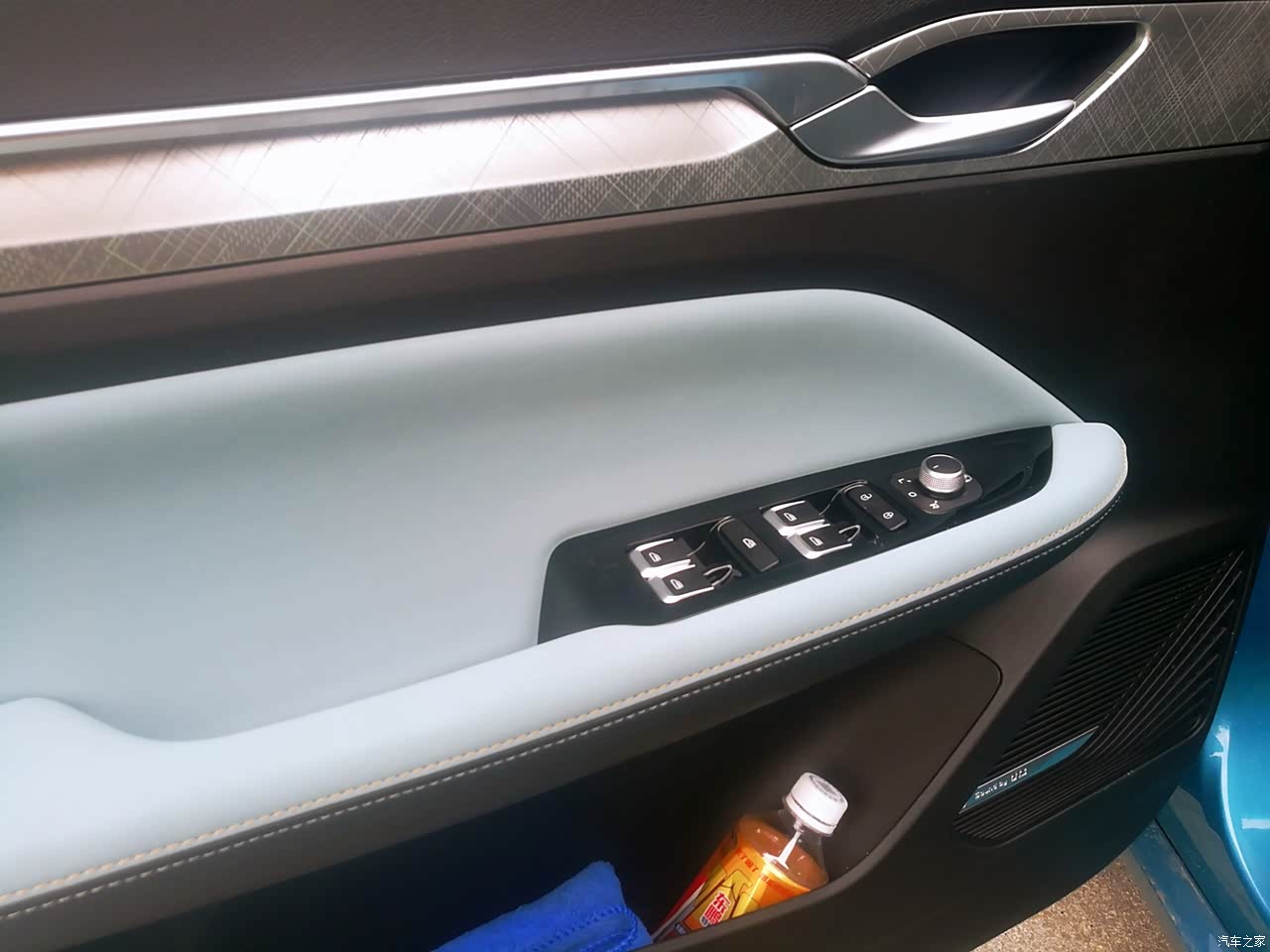 内饰上的视觉很新颖,丹青兰撞色搭配炭纤维面板,有种清新的感觉,在用料上也有档次,手能触摸到的地方都是软质材料,仿皮的座椅摸起很有质感
