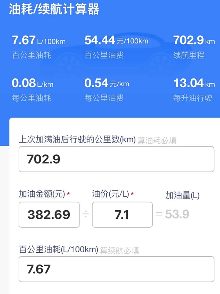我平均每个月开1400km左右,每次开到700km就去加油,实测加油为54.44L,油耗7.67L,92号油。花费400不到点,高速路段,油耗会下降到6.6L左右。
