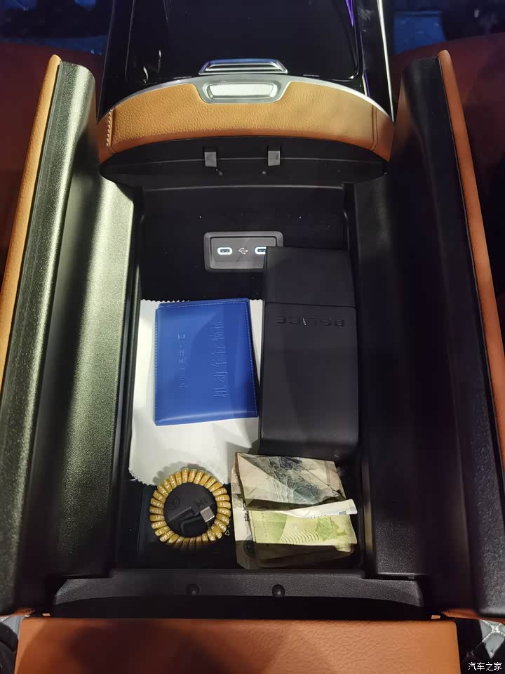 中控扶手箱很大,可以放很多东西,手机有一个无线充电区,还有一个nfc感应区,很深,杯架可以放2杯超大杯的奶茶