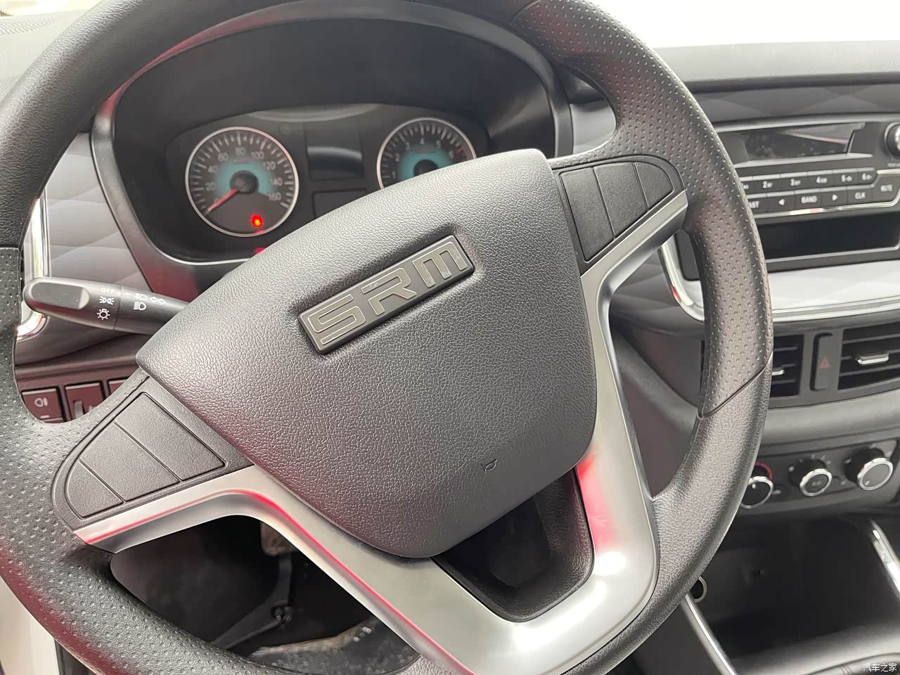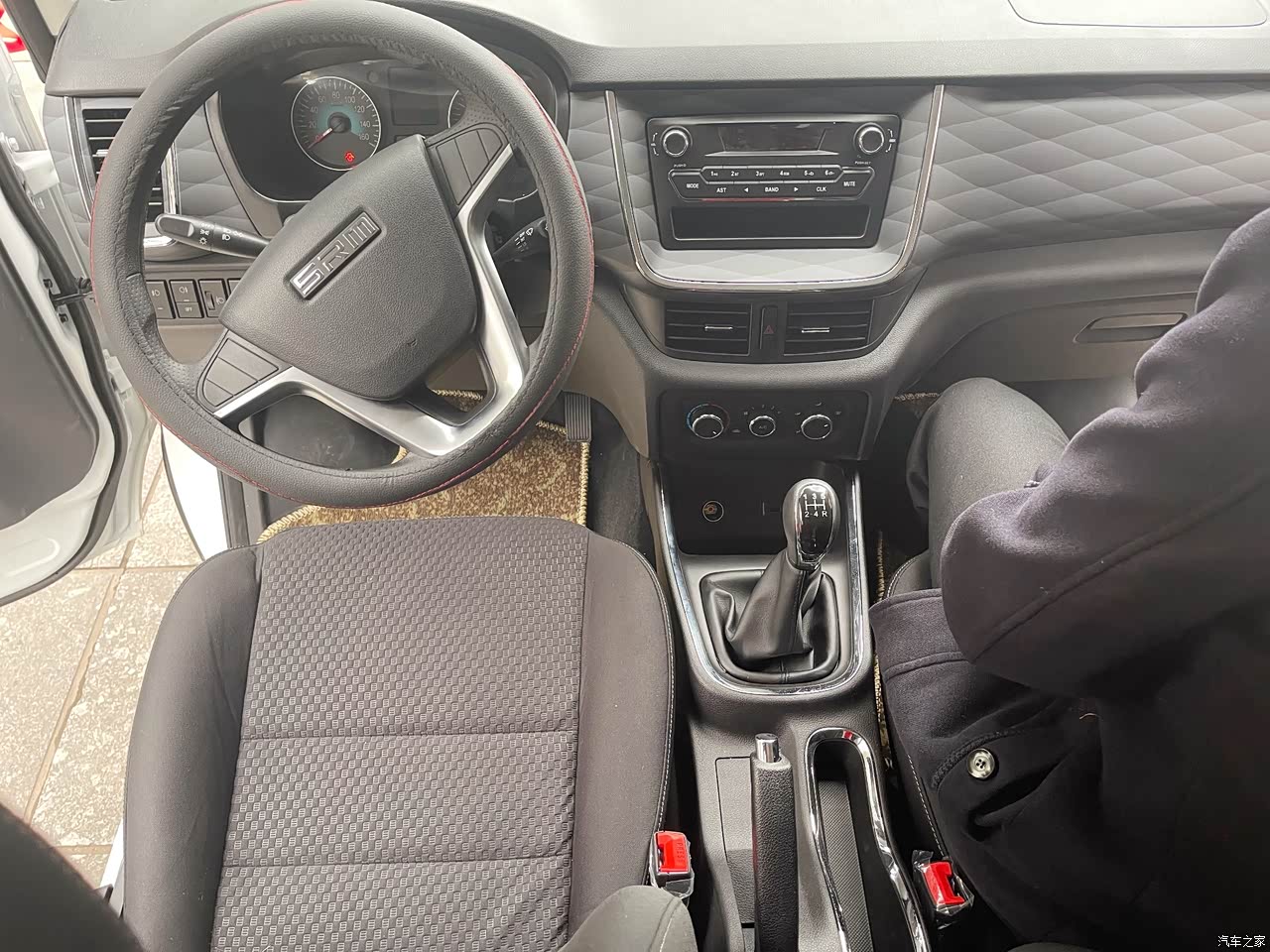 内饰以黑色为主的话就稍微经脏一点,相比那种浅色我还是更喜欢全黑的。硬质塑料的中控台,反正这个价格没什么挑的,菱形设计就也带了装饰看着有比较温馨舒适,工程狮中控就是个收音机,我对这块没什么要求,如果有需要的朋友可以加个屏幕上去。