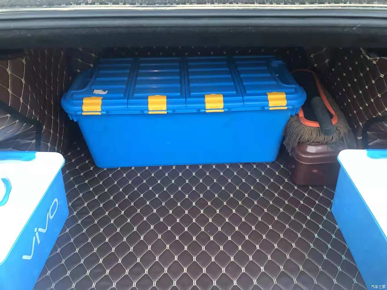 后备箱容积挺大。一个大整理箱,叫代驾时放一个电动车,再放两个小整理箱都没问题啦。
