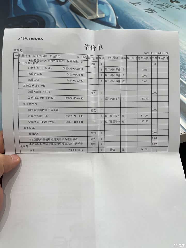 混动车型购车是送6次基础保养的,其中就包括了首保。首保做的就是换机油而已,机油(绿桶)、机油格、工时原价540块钱。由于我在订车的时候在“广本商城”里面买了99块钱抵500的消费券,我现场还买了3瓶玻璃水 1个原厂金属下护板 1个空调格,一共514块钱,用了抵用券就实收14块钱完成了所有项目,这算不算白嫖?哈哈。