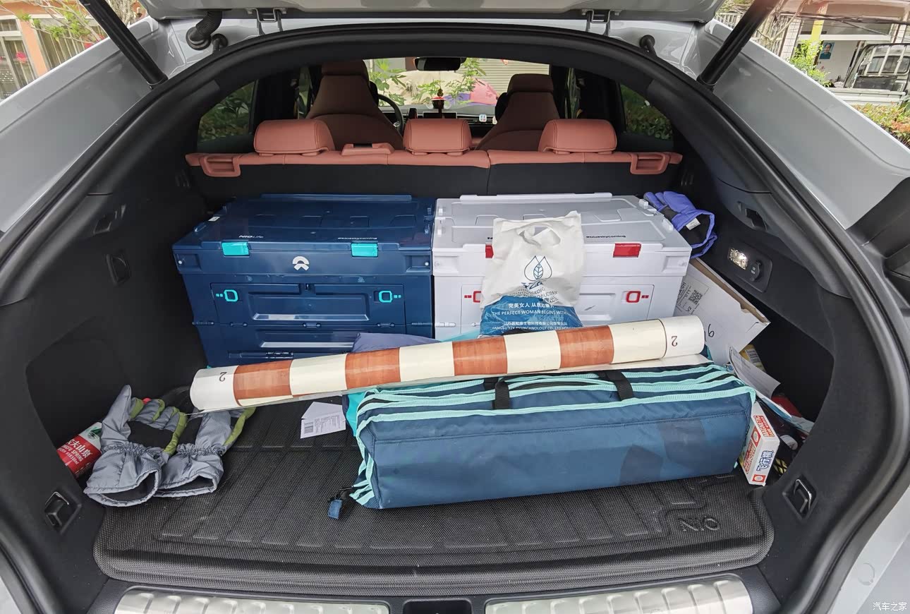正常情况下是放两个蔚来的大储物箱,以及一个帐篷,一个便携式桌椅。 最多一次放过五个小行李箱。
