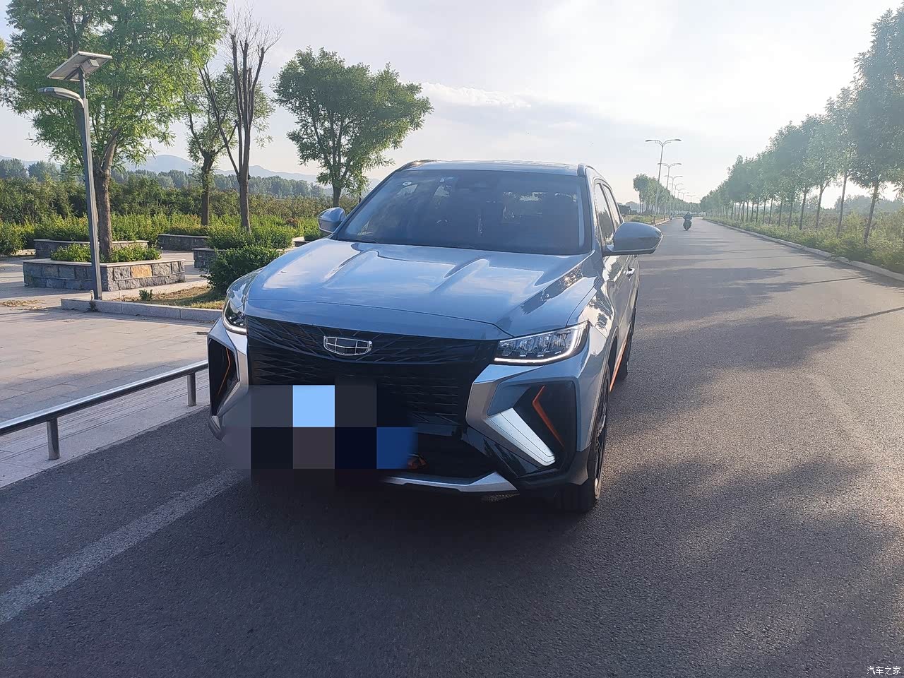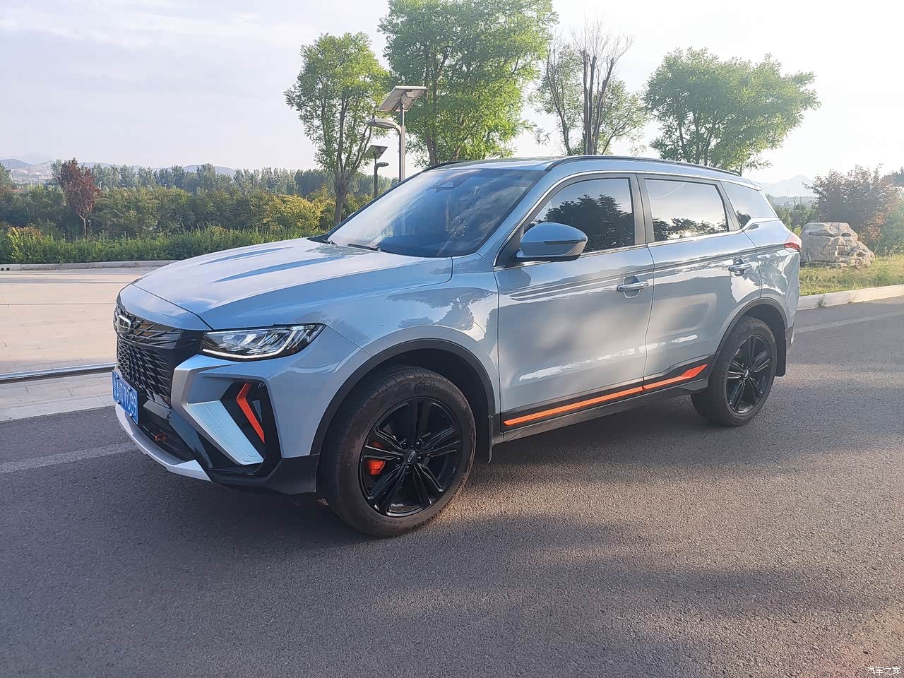 中网以logo为中心呈X型向外发散,算是吉利“宇宙回想”前脸的一种再进化。而银色的中网边框,以及导风口内橙色的饰条,以层叠的状态如能量传递般向外扩散,让整车看起来更加科幻。