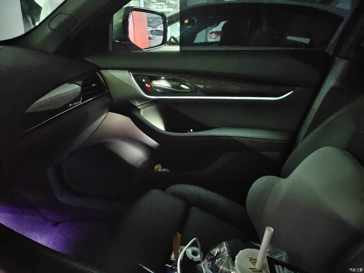 内饰用料是你看得见的扎实,随手触及都是真皮,走线也很好,手套箱扶手箱都是植绒的,真的很良心。网上说内饰不好看,当你坐进来感觉是不一样的。我调的极光青同色氛围灯,很好看。