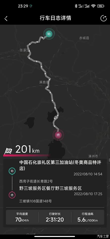从张家口到野三坡,200公里的路程,很多隧道,限速80-100之间,纯油,亏电跑的,百公里5.6个油