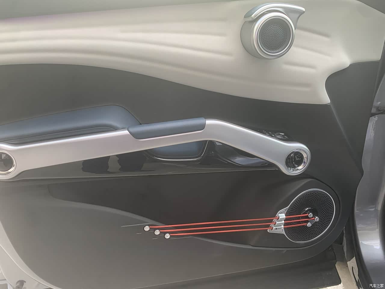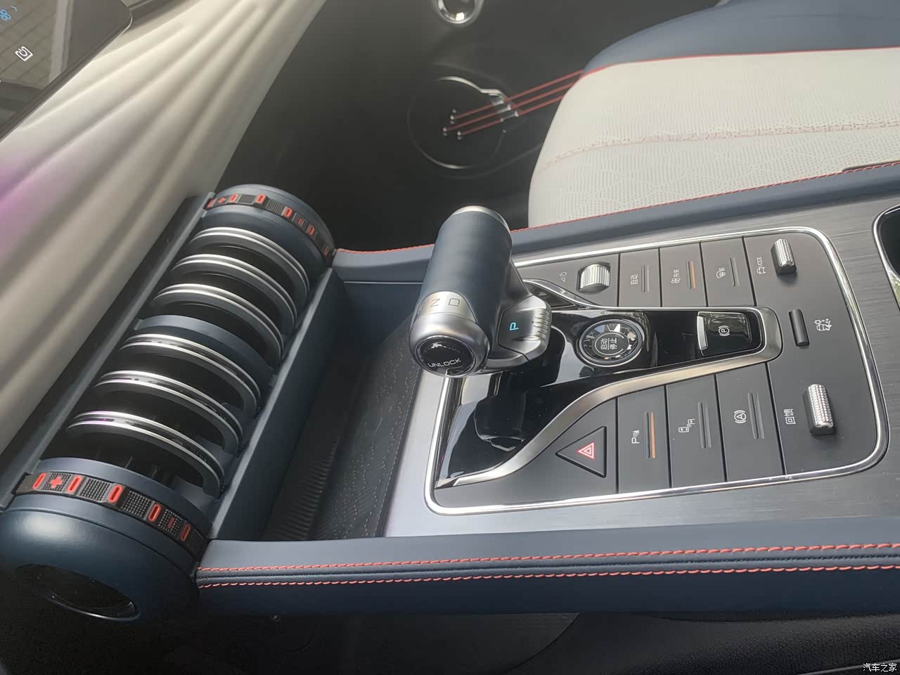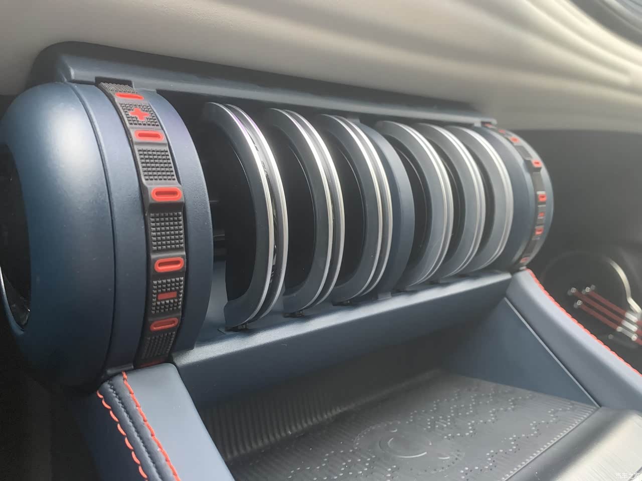 这个门把手,我感觉我身边所有第一次接触这台车的人,总会被惊艳到,包括我自己,独特又不会带来不适的使用体验感,着实在我个人加分了不少,扶手也是带着慢慢的设计感,最爱的就是下边的吉他设计(其实我感觉更像是贝斯,毕竟我自己有玩点乐器,这个弦的粗细感觉和贝斯更接近),实在是一个吉他、贝斯爱好者无法抗拒的一个点 空调出风口,就像是健身房的哑铃片,运动风满满的让我无法自拔,毕竟我也是办过健身卡的人,虽然就去了一个礼拜;下边防滑放置手机的格子,携带无线充电,这解放充电线的设计就让我很爱 超长超大的全景天窗,无懈可击,不知道全景天窗对于大家的用处大不大,反正我很爱