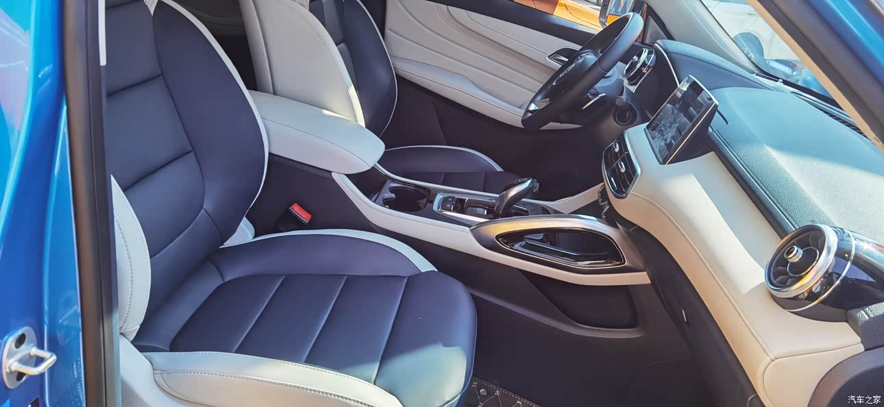 内饰采用是蓝色和米色的撞色设计,大面积的软质材料包裹,高级感和触感都十分高级,整体感官更为突出,坐在车内手握真皮三福式平底方向盘,正对面还有两个圆形可随意调节的空调出风口,256色交互氛围灯和剧院极BOSS音响包围着你,车内还有一块12.3英寸交互虚拟仪表盘和一块10.1英寸高清触控大屏,配备了斑马智能语音交互功能,复古又不失科技,运动又不失舒适,清新脱俗,我非常的喜欢。