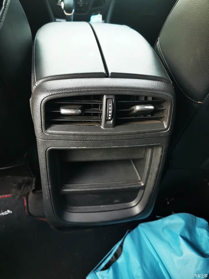 集成在超大扶手箱上的,后排出风口,风量大,而且角度可调,风口可关闭。下面还带走储物槽!