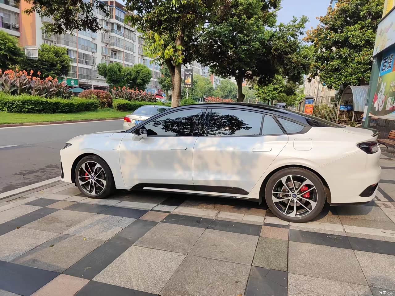 我选择的顶配玉盘白,白色耐脏,最开始是在白色和灰色之间纠结的,最后听了老爸的意见选择了白色。运动套件加上19寸的大轮毂,也彰显了美系肌肉车的感觉。