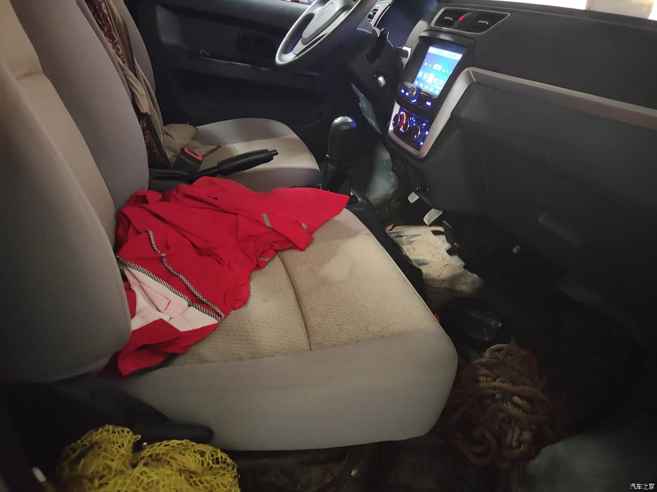 内饰设计的比较简单大气,基本上都是塑料的材质。但是比较环保,没有异味儿。操控台的倒车影像比较实用,还有下方的旋钮。操作简单。座椅的材质是织布的,很透气,而且这个颜色也耐脏。