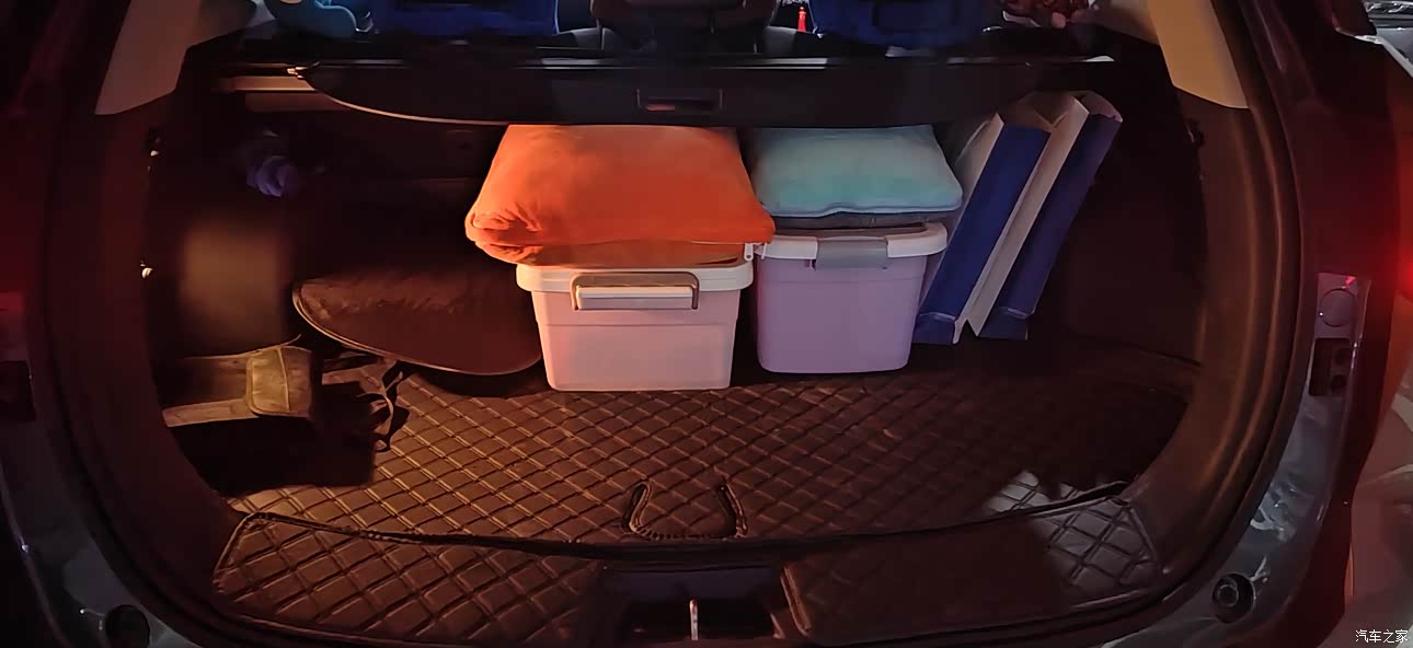 后备箱有很多小的储物格,并且有缓震泡沫,能够放毛巾,防滑链,套筒工具,急救包,2个整理箱,整理箱里面装的矿泉水和红牛,很实用