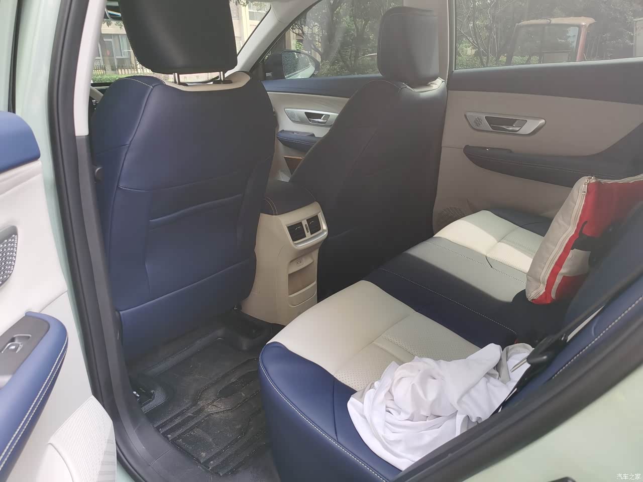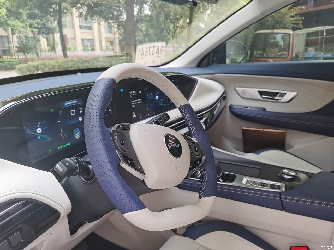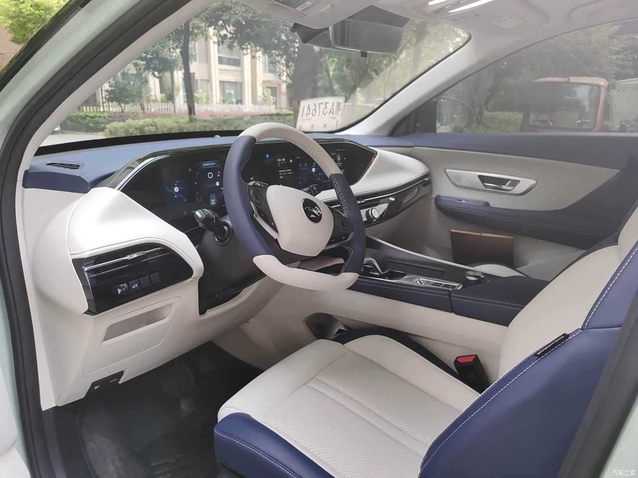 车子的内饰是可以选择的,只有深色内饰和白蓝内饰两个颜色,感觉深色都腻了,所以最后还是选择了蓝白色,看着确实很大气,只是浅色确实不耐脏,平时打理起来要稍微麻烦一点,车子的布局还是很不错的,特别是中控的双联屏看着很漂亮,现实也很清晰。