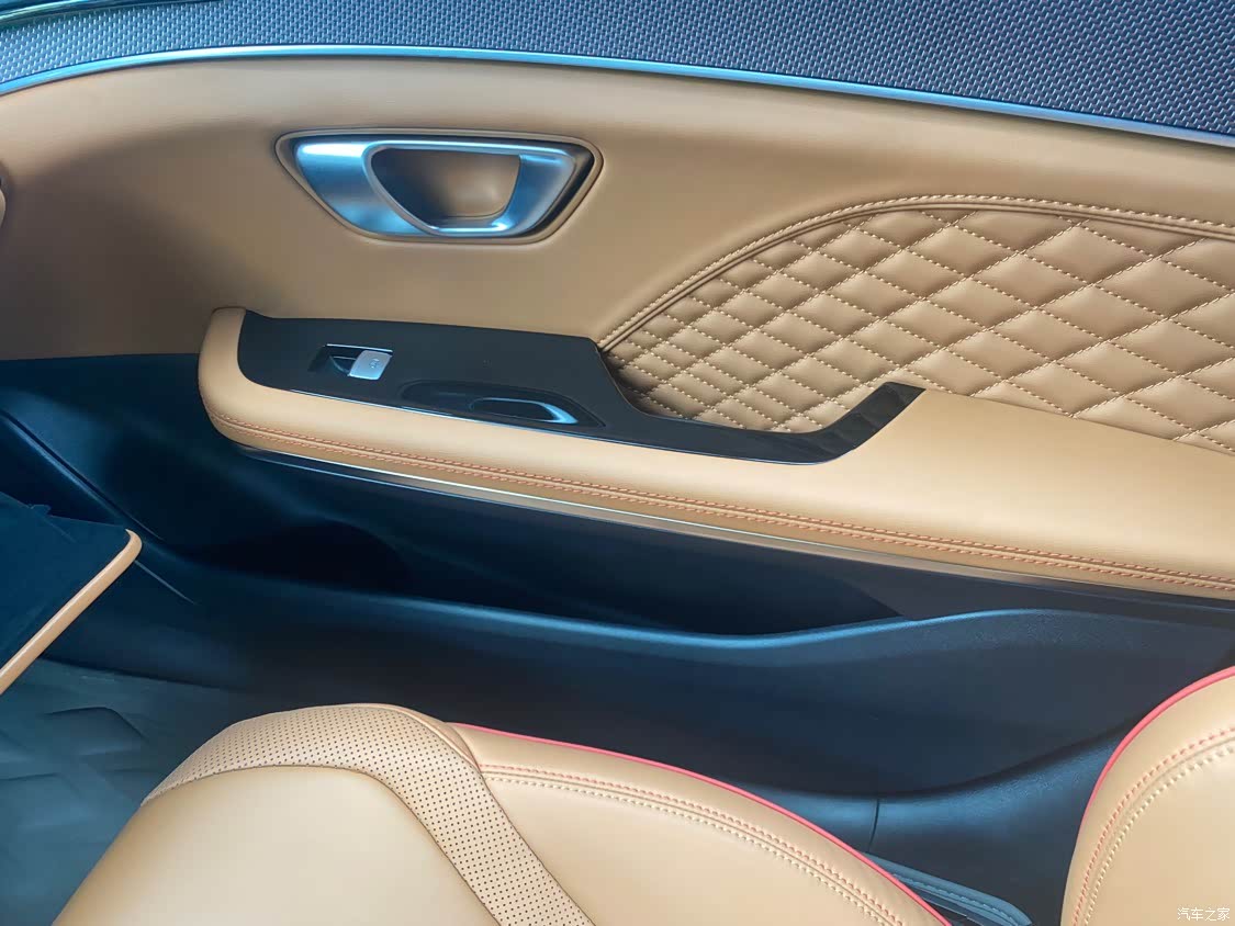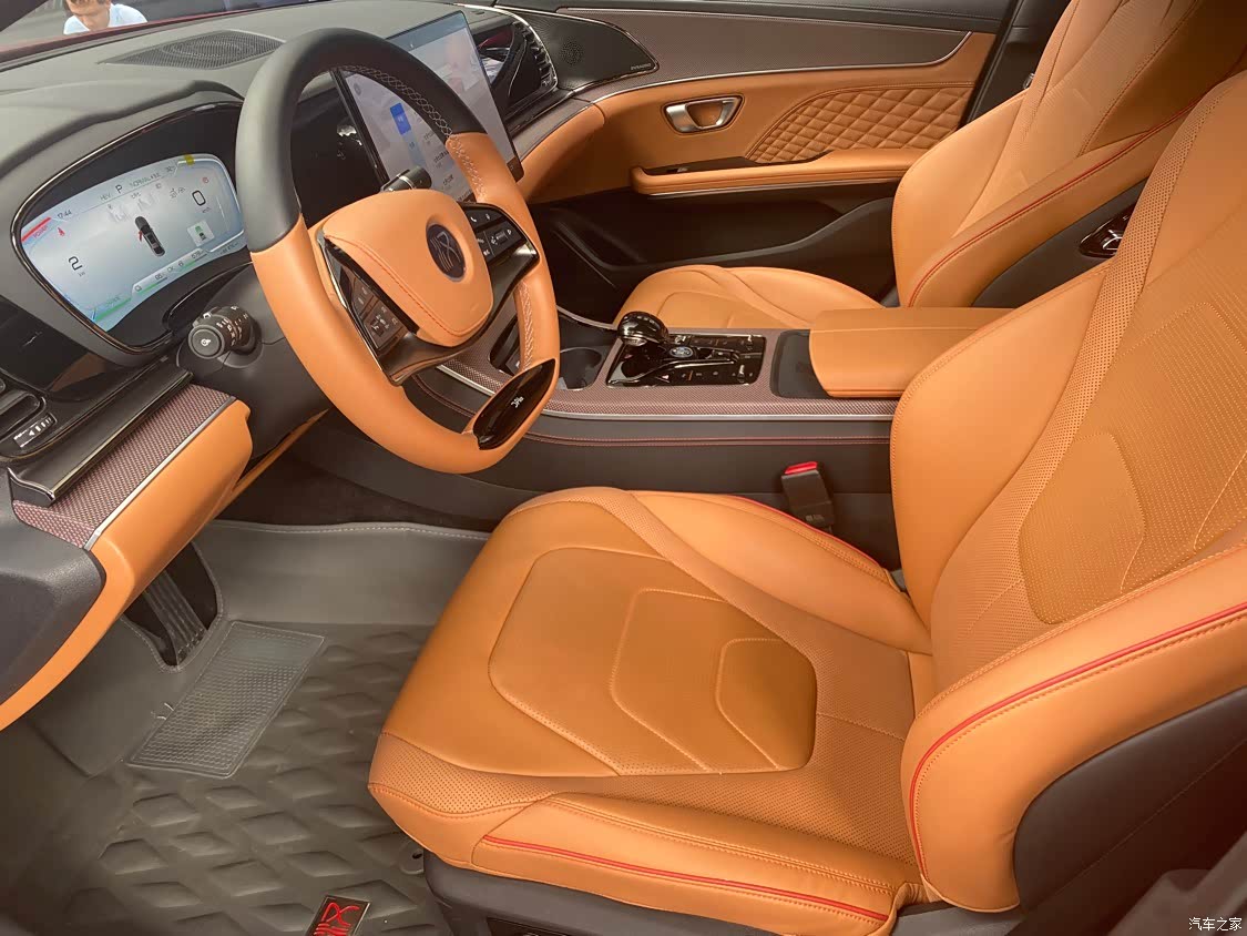 因为我考虑这款车型的话啊,全车就是真皮的。真皮的话,肯定是手感比较好,而且他就说有些时候在太阳光下暴晒一天,不会产生其他异味出来。我选择这款车型呢,里面的面板还有碳纤维面板,我的朋友坐进来看见这个车内饰,他感觉二十多万的内饰不会有真皮和碳纤维面板,我朋友格局小了,下次必须得带她提一台汉。