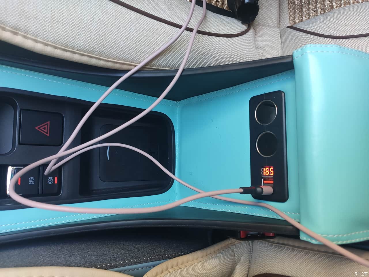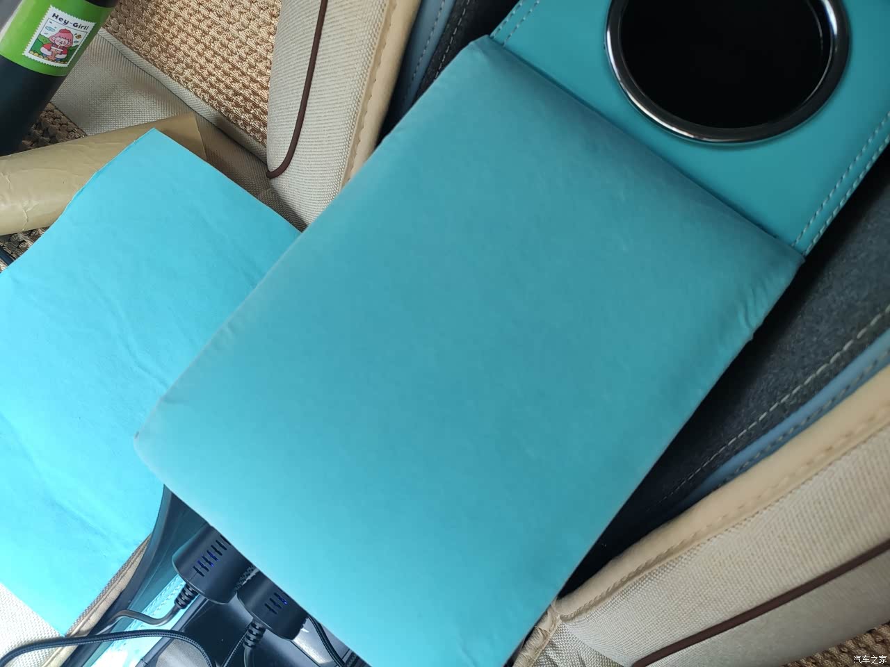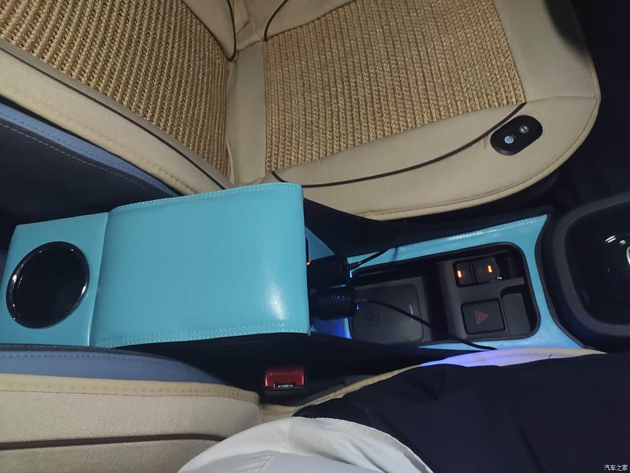 前排空间比较大,前女友说坐着和普通小车差不多,如果不看后面的话。 感觉缺个托手的地方,原厂小木棍不大行。 自己换了个扶手箱(这扶手箱卡安全带,不好),带快充直插点烟器取电,可以分流两个点烟器,接上两个通风座椅垫(这个垫子简直神器,特别现在天气越来越热),原车usb口留给记录仪,不动原车线路,免得自燃😨 扶手箱皮质太差,又加贴了麂皮,防汗且舒服了很多。