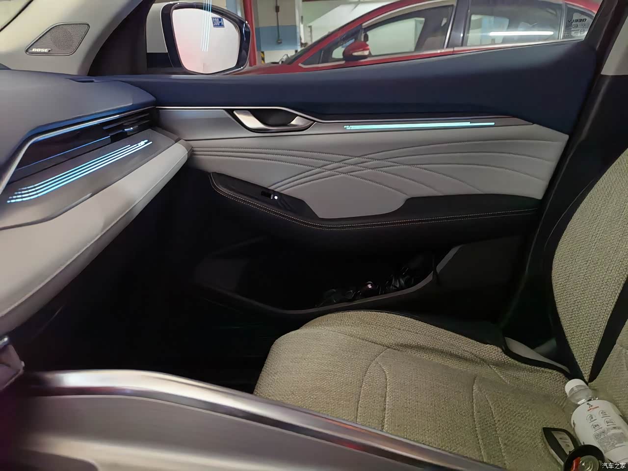内饰总体感觉到位,不像其他车型,空调按键,多功能方向盘按键都使用触摸试,有些还需要通过屏幕去找空调按键,这点做的还是比较到位。氛围灯多点颜色就好了。新车买回来的第一天就没感觉车里面有异味,点赞。