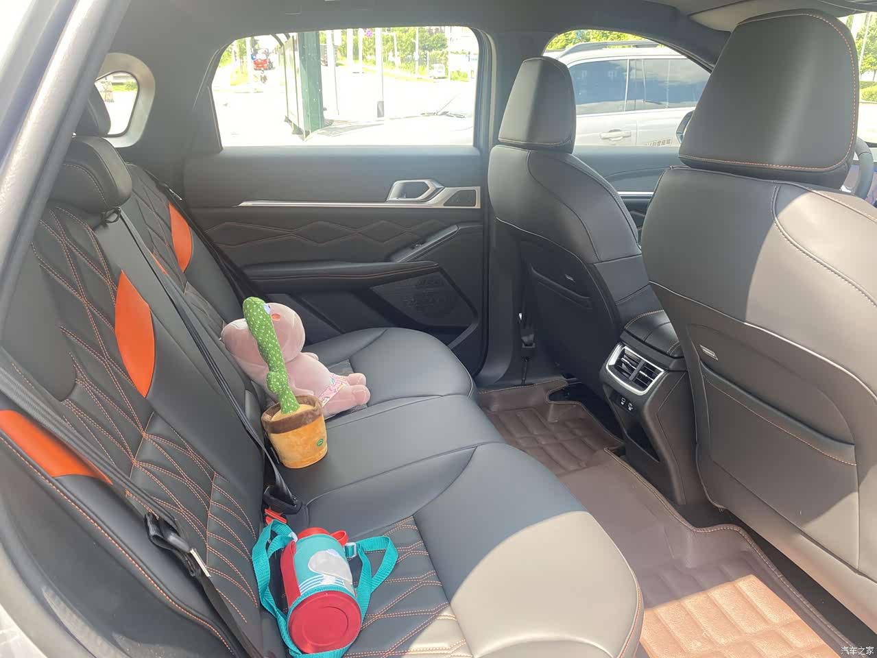 这个车比一般车要长一些,2米8的轴距。后排空间是值得骄傲的,翘二郎腿还有很大的空问,而且中间是平的,没有凸起,比较舒适。坐垫柔软,海绵的回弹好,整体的感受就是空间大,座椅俯仰角度好,不像坐小板凳一样,果然还是中国人最懂中国人呀!