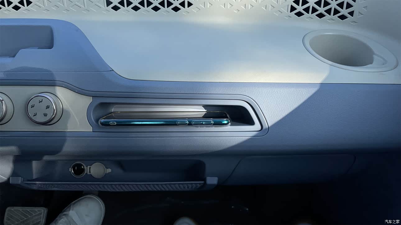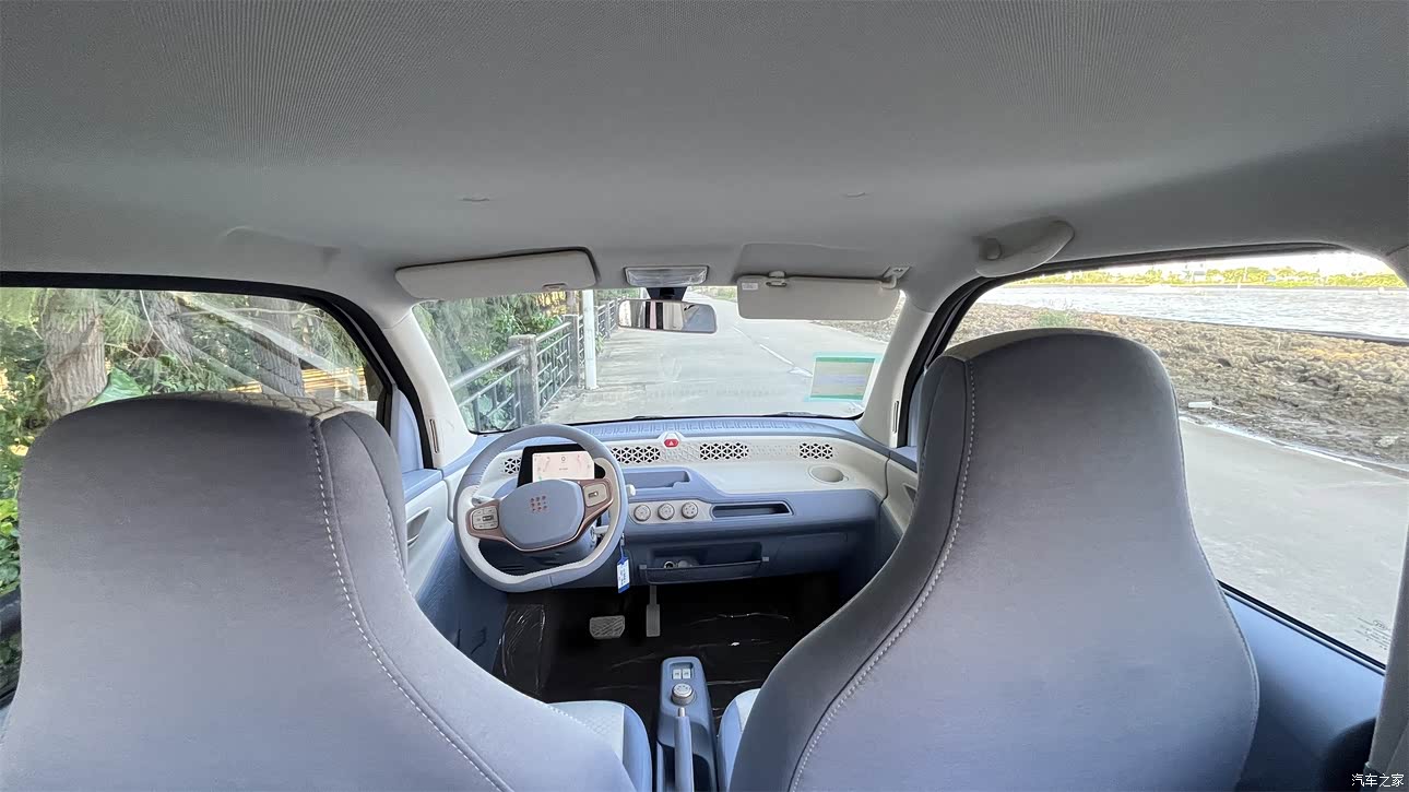 内饰设计我感觉有点过于单调了,跟可爱配色的外观有点不搭,整个内饰配色类似于是一种米白加蓝灰色的,反正说不上来是什么颜色。座椅也是布艺包裹的,不是很耐脏,特别是像我经常要接送小孩的,小孩没坐两天就给我按了两个黑掌印上去,还是得自己加些座椅套上去。中控台几乎没什么功能,如果要导航的话只能用手机,这点有点不方便