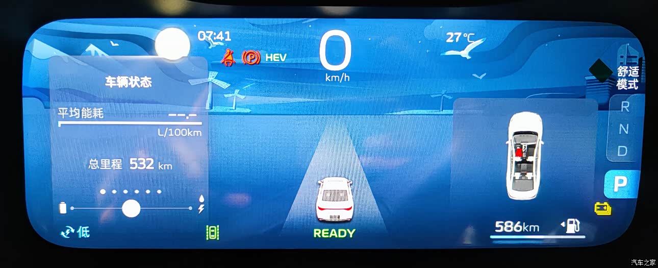 官方宣称纯电续航100km,实际纯电跑了72km,还剩13%电量就强制切换混动模式了。不过考虑原地开了3h的空调,当天气温36℃,姑且算有80km纯电续航吧。