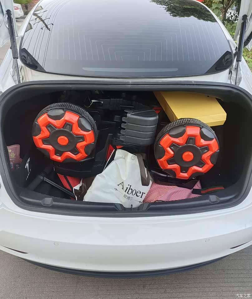 后备箱容积和特斯拉的其他几款车型比起来稍显小一些,但是也够三口之家用。我现在是放了一辆大挖掘机。