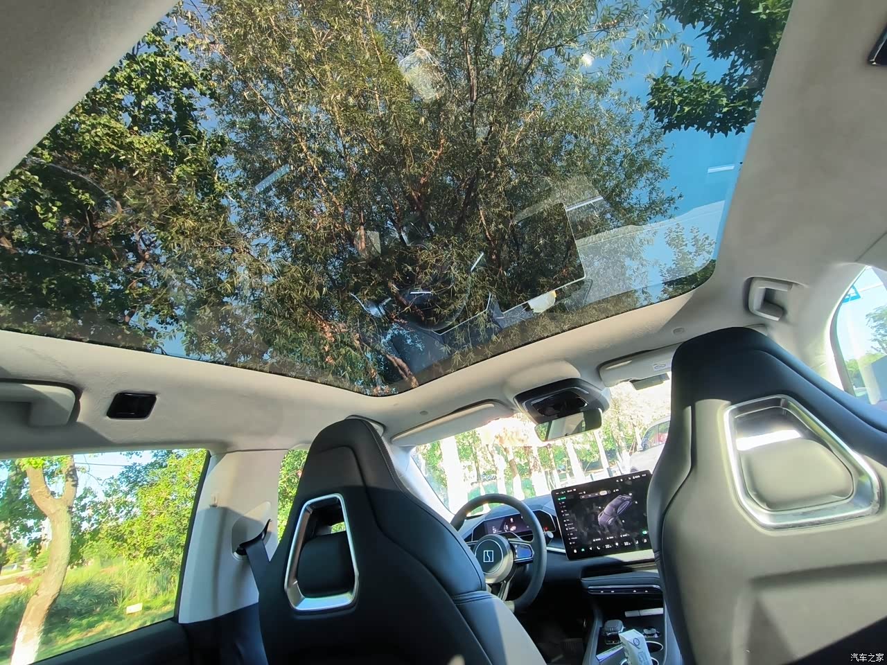 没有选装内饰,但是碳黑内饰足够好,设计风格简约而不失豪华,用料到位,车内基本没有异味,不过内饰有的地方硬塑料比较娇贵,很容易留划痕,全景天幕很大很有逼格,后排视野很好。