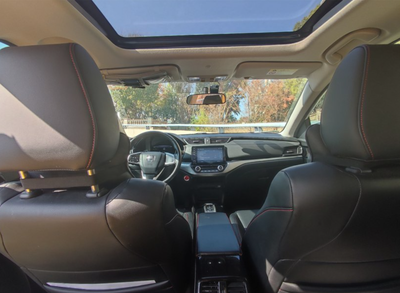 这天窗我是真的喜欢,尺寸感觉要比一般车要稍微大一些,能够让整个车子内部特别的敞亮,坐上去一点儿也不会压抑,对晕车的人很友好吧,