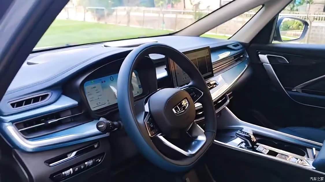 内饰的吉利风格很明显,大尺寸悬浮中控屏很科技,软包材质也是很不错的,摸着非常舒服,这个普鲁士蓝的色调也是绝绝子,很高端的感觉,看着也不想纯黑、或者纯白那么单调,还没多大的异味。
