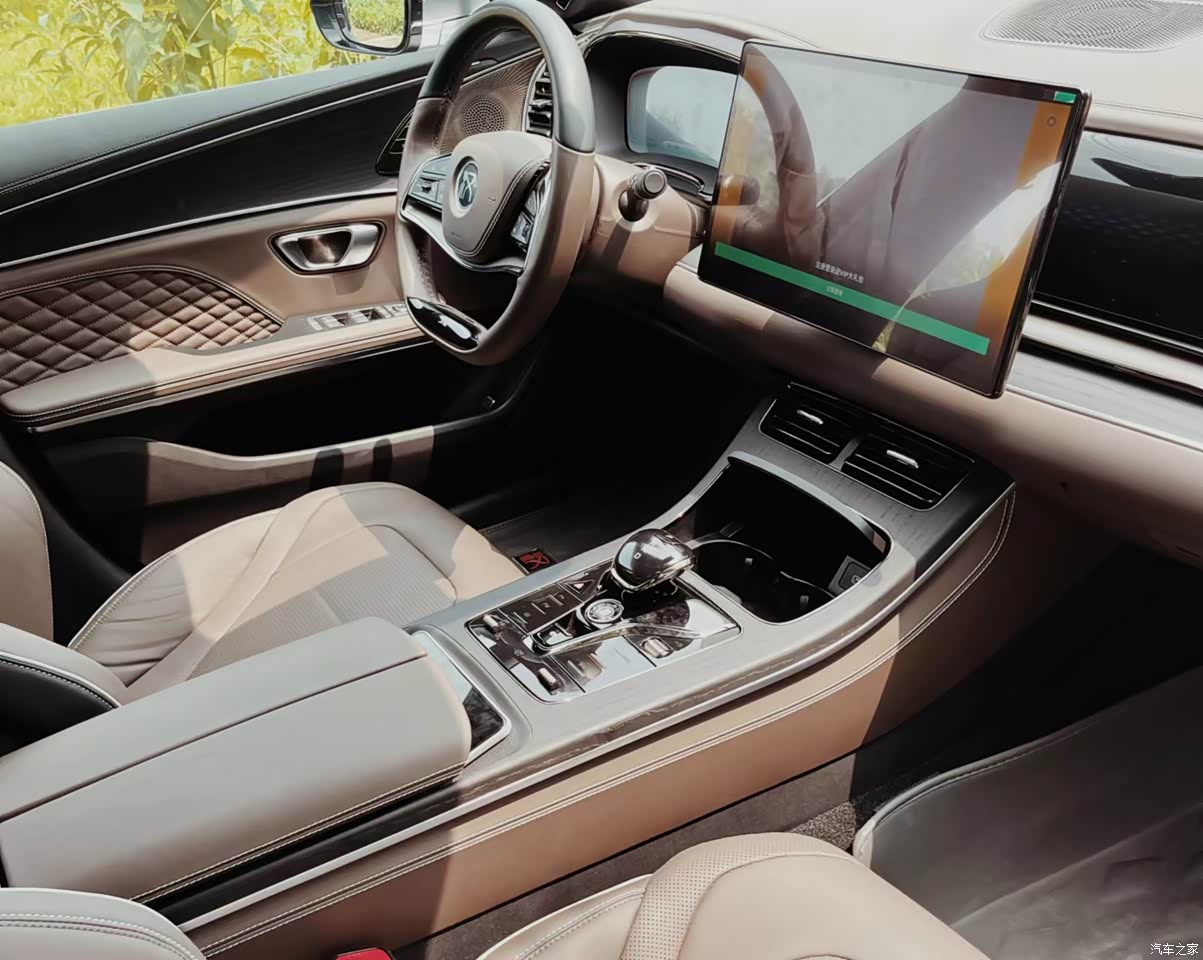 内饰和外观一样是稳重但不死板的那种,车内采用了大面积的棕色真皮,我第一眼看觉得有点单调,不过在这之后我又注意到了菱格皮面和亮黑漆面的饰板,好像给车里带来一种贵气精致的氛围感。车里的座椅的填充物厚实柔软,对我这种中年人很友好。最近天气有点凉了,我还经常打开座椅的加热功能,真的非常舒服。