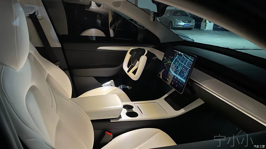 内饰比较简洁明了,整个中控台没有多余的按钮,所有的操作都是在中控的大屏幕上完成,而且所有的功能一目了然,清晰度也非常高,中控台以及座椅的的材质及做工都很精致,上手感觉很舒服。当时是加了8000块钱选配了白色的座椅内饰,搭配后来自己又改的方向盘,有一种太空座舱的感觉,科技满满未来感十足。简直越看越喜欢。
