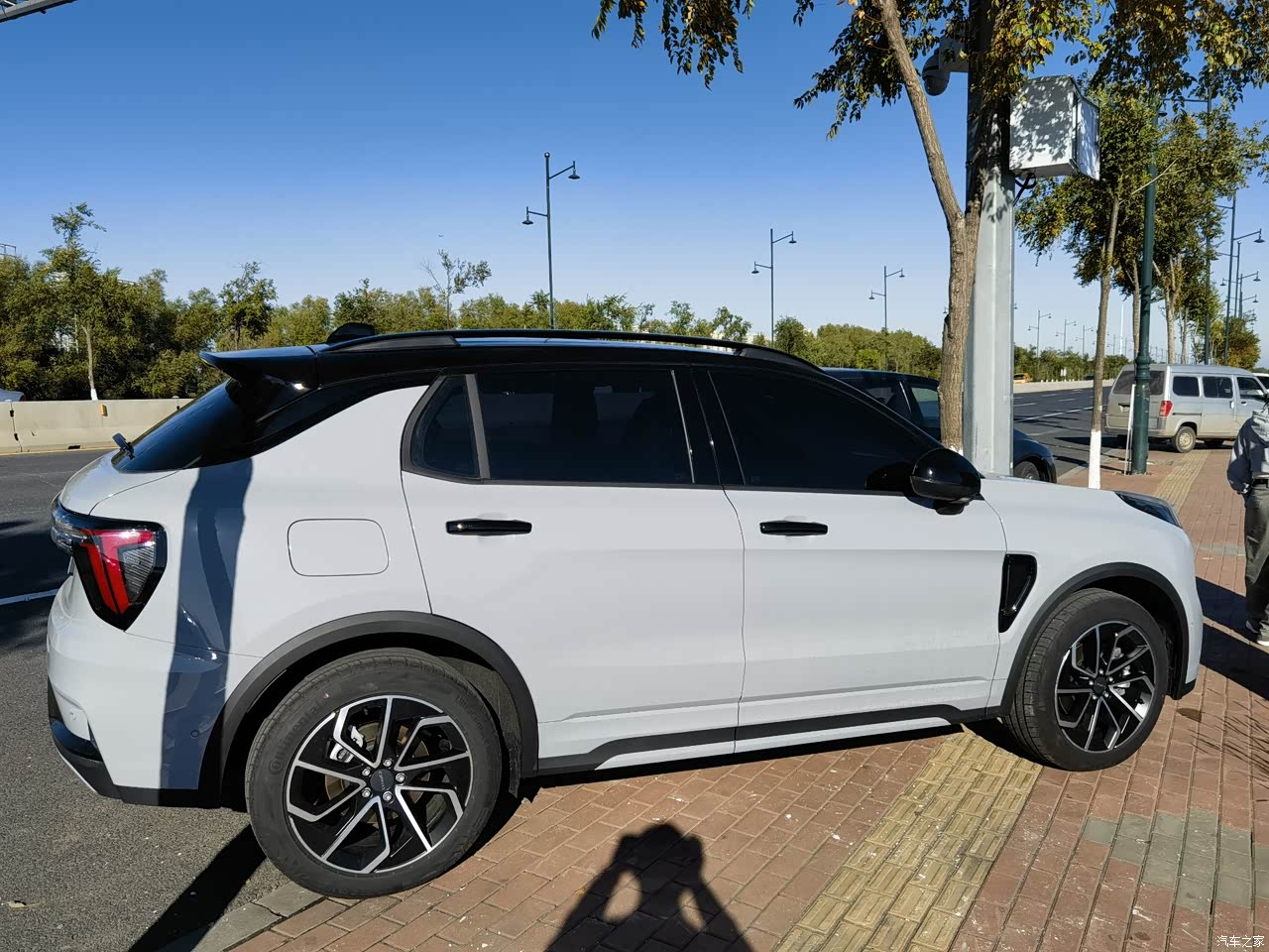领克的家族式设计见仁见智,晨曦蓝配色十分独特,阳光下有一种灰色和蓝色互相混合的感觉,贯穿式尾灯带动态效果,非常好看,悬浮式车顶的设计非常时尚,侧面翼子板细节好评