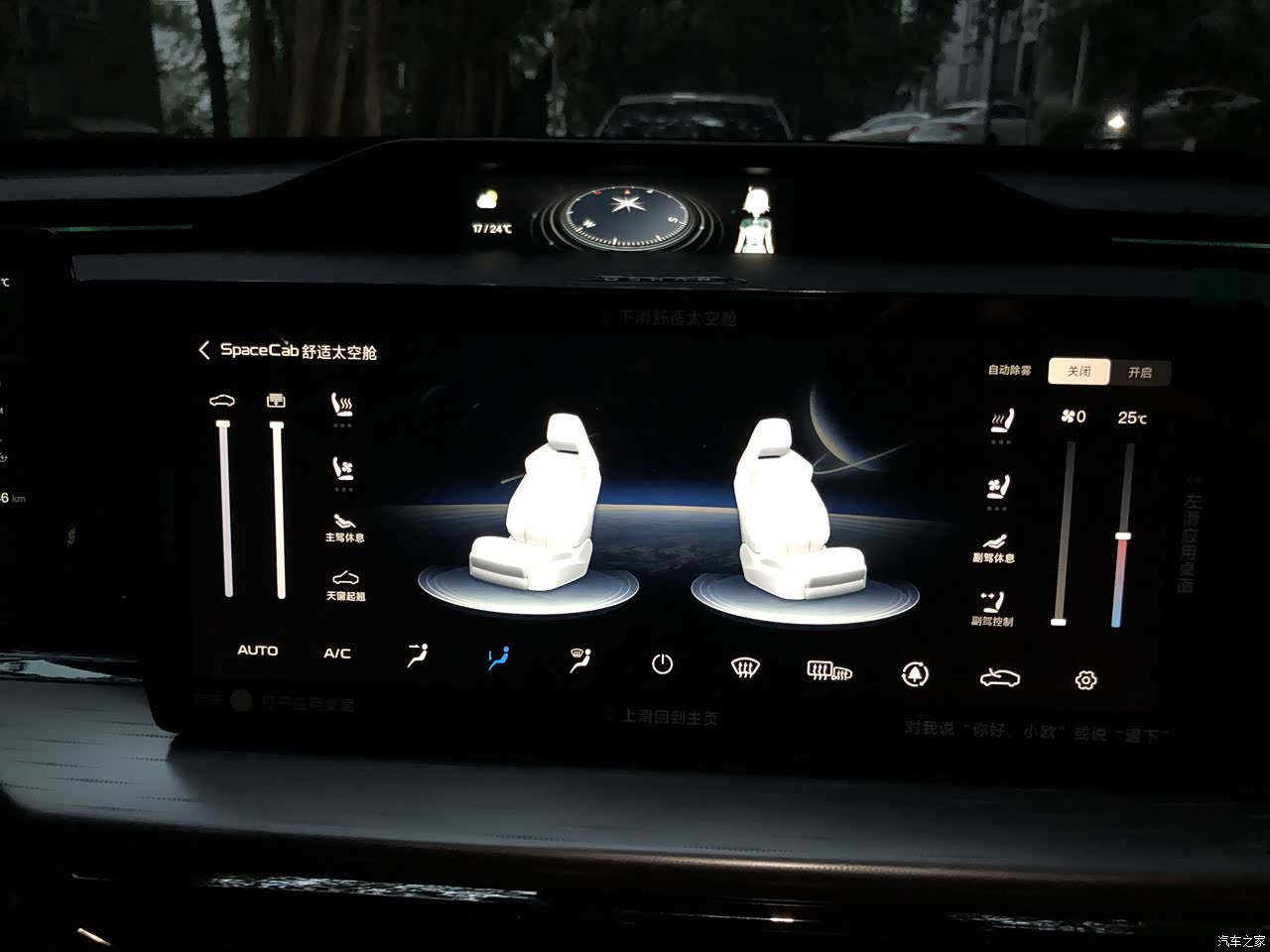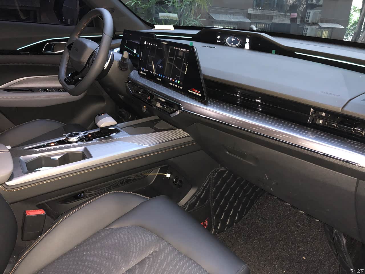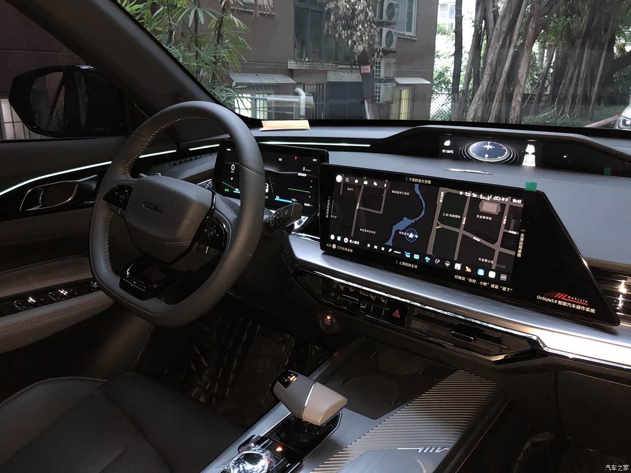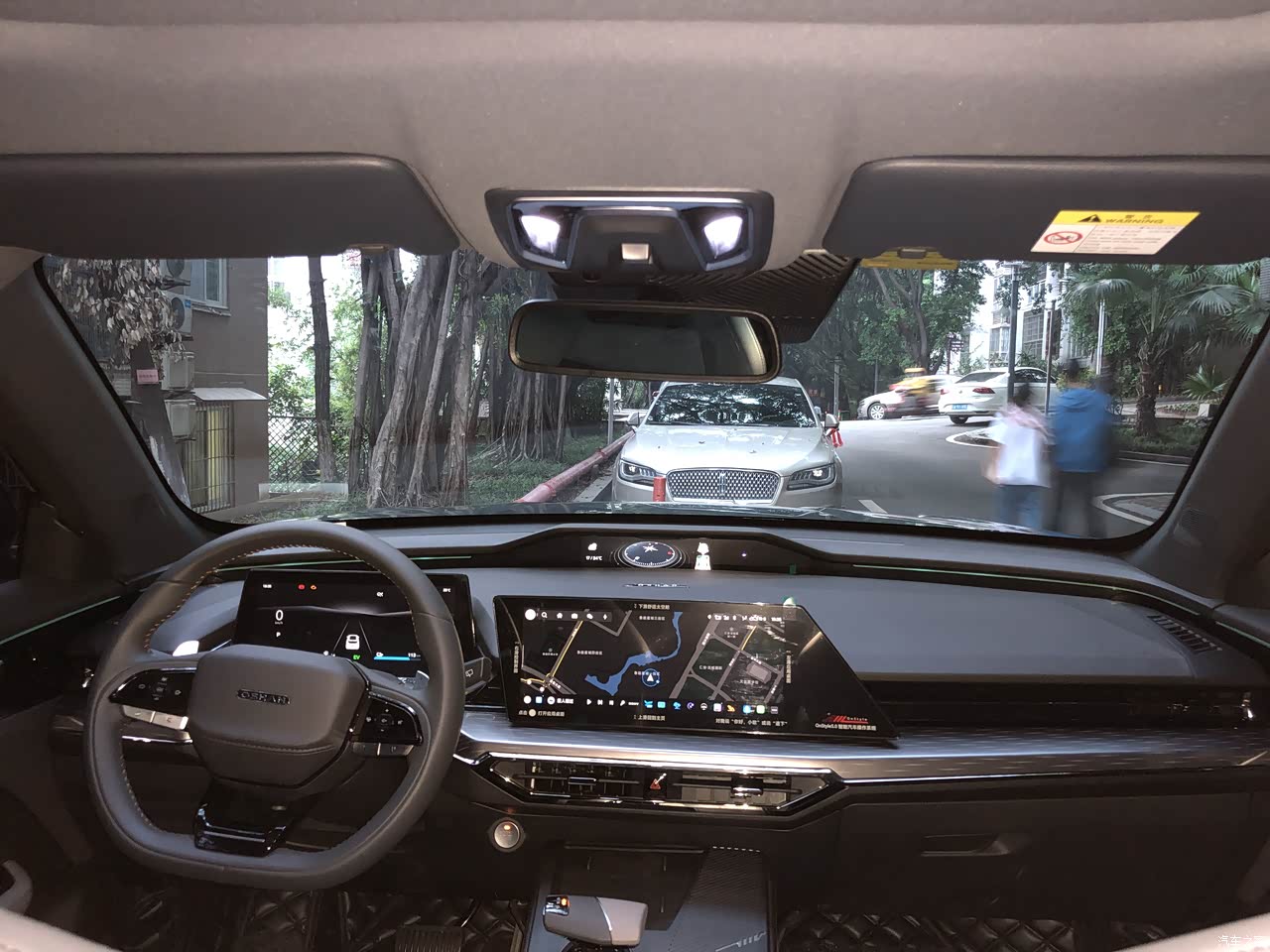 内饰好看,我选择的是深色内饰,搭配一些灰色,很喜欢这种风格。\n\n最吸引人的是三联屏,错落有致,小欧屏带摄像头识别车主,座椅记忆调整到你的常用位置,导航还能三指飞屏,导航界面可以放到任何你需要的屏幕上,很有科技感。\n\n内饰软包区域很多,内饰板上能够触碰到的都是软的,手感不错,台板上表面也是软的,配合一些很有质感的装饰件,一点不油腻。\n\n中控区域一些常用的实体按键布置的位置不错,使用起来也很方便。车顶全景天窗,通透舒适。\n\n另外车机也不错,界面操作反应快,语音功能不错,比如常见的,“我要听歌”、“我要回家”、“打开座椅通风”、“打开天窗”等,这些几乎每天都会使用。\n\n特别要说的,小孩特别喜欢无麦车载KTV功能,唱踏山河和孤勇者,还特别喜欢爱奇艺看小猪佩奇等。