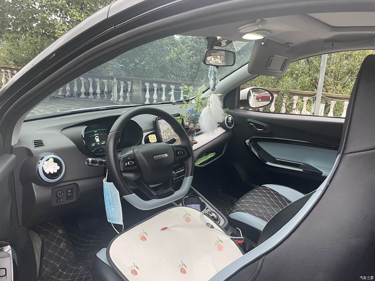 内饰方面,我选择了蓝色,整体感觉比较清爽,看着漂亮而舒服。仿皮座椅造型非常独特,有一点电竞椅的感觉。主副驾都是电动调节的,最重要的是副驾还有老板键,方便后排乘客的进出,还非常方便。电子式旋钮换挡对我们女生来说也非常好用。方向盘倒是真皮的,握起来感觉挺舒服的。