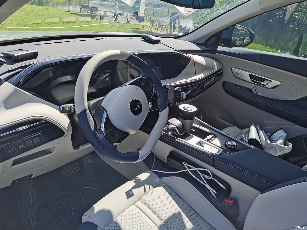 我选择的是浅内饰,蓝白相间的皮座椅,仪表台的2块智能大屏,全车大部分的软包,做工精致。完全不输30万级别的车