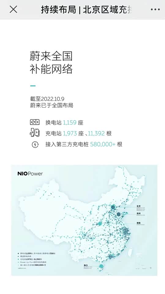 这个就是蔚来非常大的亮点了,截止到2022年10月9号,全国的换电站已经打到1159座,目的地充电站1973座,充电桩11392根,第三方充电桩甚至达到了58万多根。北京的换电站已经快100座了,东边和北边居多,现在已经由1代站发展到2代站,听说3代站也要上了,1代站电池略少,2代站已经由10几块了,3代站可能达到20多,1代站需要小哥来把车停进去,2代站就不需要了,人在车里就行,5分钟就完事,现在很多2代站都是无人值守了,晚高峰的时候排队还是比较普遍的,别扎堆去就行,反正我基本都是中午去换。还有就是蔚来对换电站不多的地方设置了很多红包桩,都是免费充电。我没有安装家庭充电桩,要的是每月6次的免费换电权益,在北京上下班完全够用了。