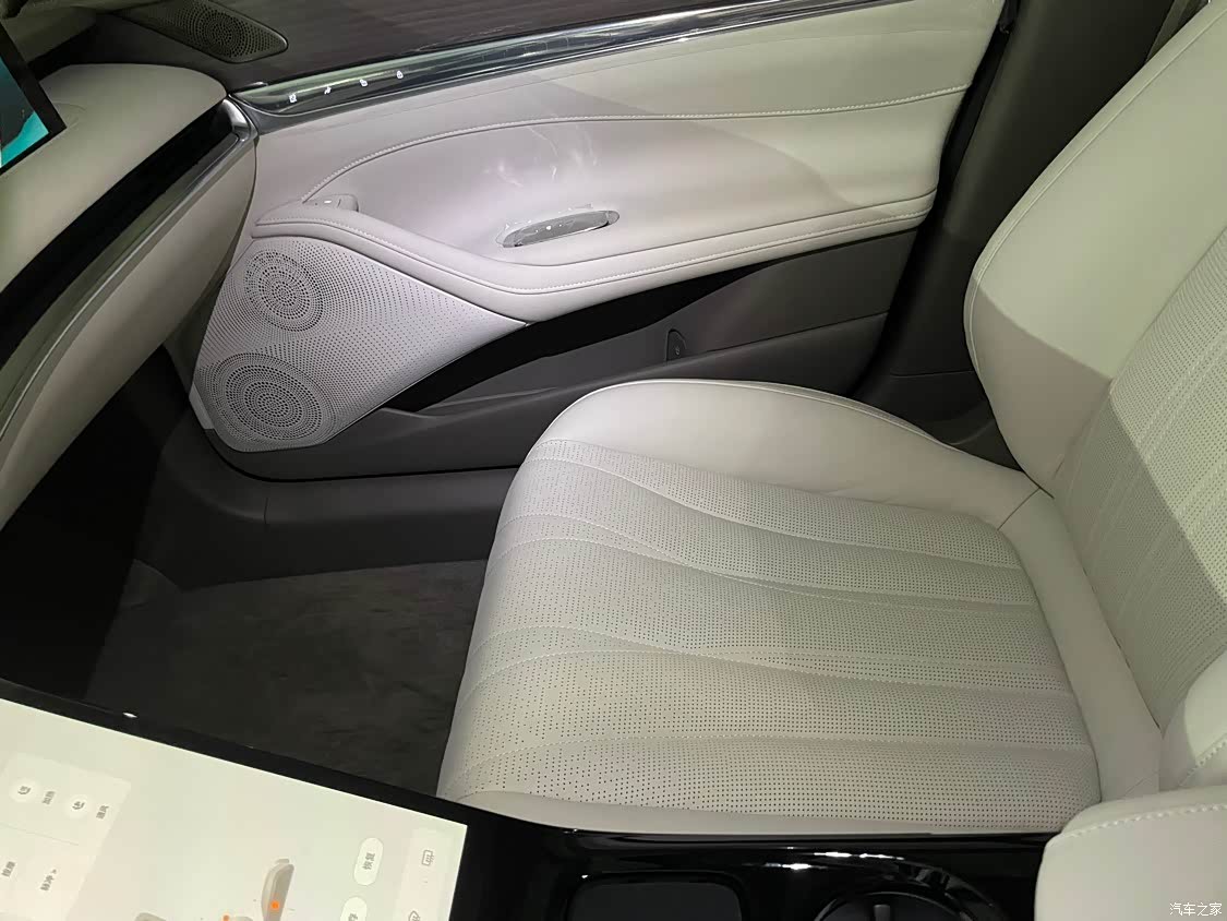 极简主义风格,艺术感比较强烈,基本没有什么物理按键,都是触屏按钮,设计的很好,也很灵敏,比较高级,我的是白色内饰尤其显得大气,座椅用的材料是半苯胺真皮,座椅很舒服透气,摸起来手感也很好,座椅上门板上有一些特别的logo,比较有质感,皮质和木质使用搭配,比例很协调,所以整体内饰看起来高级感满满,完全没有其他车那种塑料的感觉。