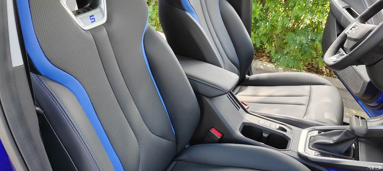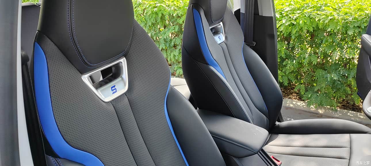 内饰的风格也是偏运动型的,但是舒适性依旧在线。方向盘是地形的设计,方便进出,前后移动也不怕膝盖顶着。 座椅是一体式运动赛车座椅的设计,整合了头枕与靠背,坐上去就想体验一把追风的感觉!