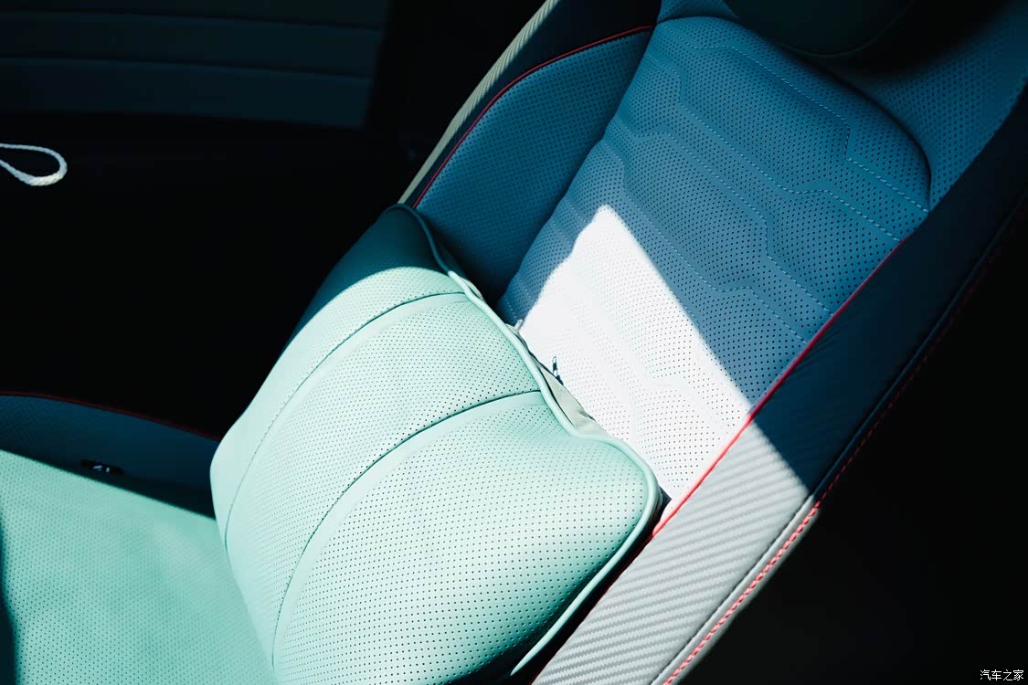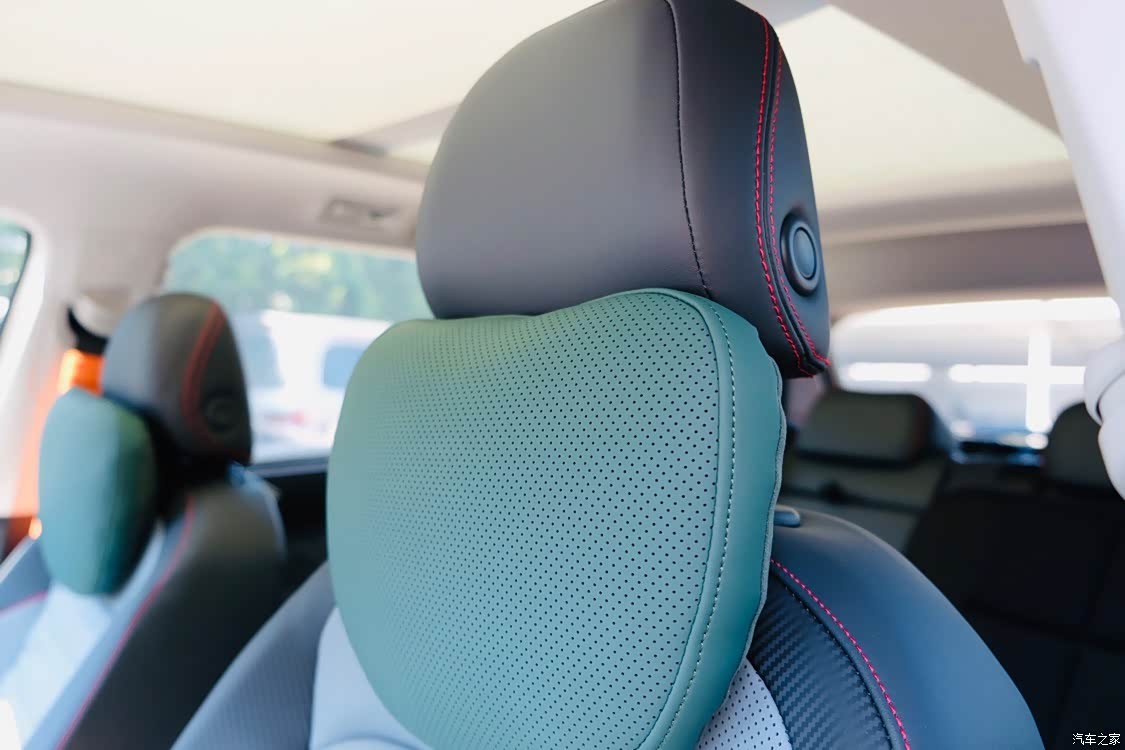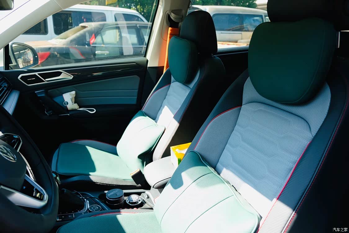 来看下座椅吧。一体设计的深浅灰撞色座椅,打孔仿皮材质,但视觉和触感绝对ok。我为座椅采购配置了Napa打孔坐垫、腰靠和头枕,墨绿、深灰相得益彰,完美匹配,这两个颜色我考虑了整整一天,大家可以借鉴参考。