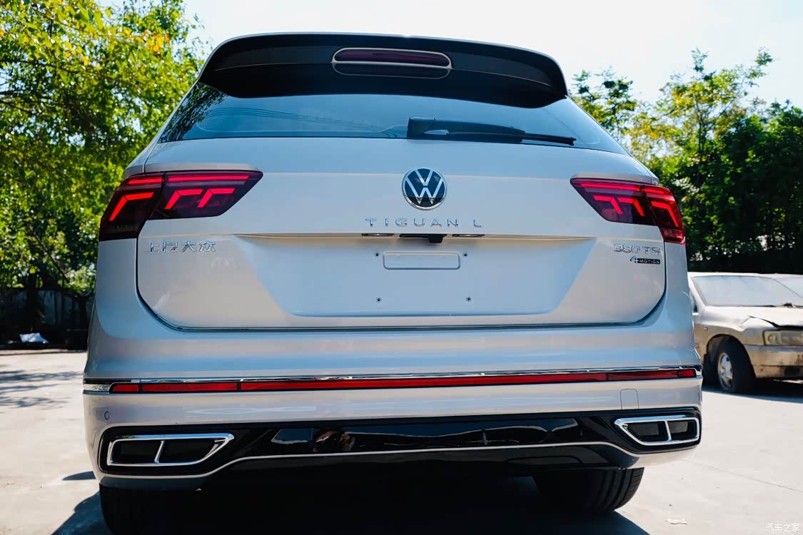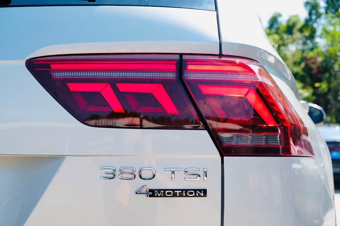 看了头,看了车侧身,我们来看下尾巴。一辆好车,绝对不能虎头蛇尾!如果说新途观的头设计够“骚”,那么它的车尾设计,就是它秉承一款德系车应有的稳重、中庸、和谐之道的最佳语言。对比上一代,车尾灯通透性、质感度更好,倒L型的led灯、流水转向灯,无论在白天还是夜间,都是超有感觉、极具辨识度的。车灯下方的380tsi和4motion,就是它展现自身实力的最佳“勋章”。