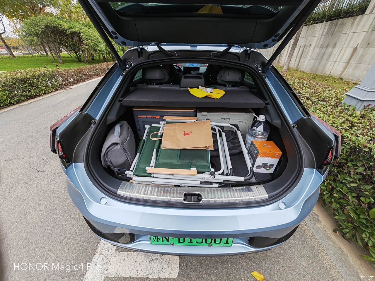 后备箱空间同级中上,而且盖板下还隐藏一个超大储物空间,平时把不常用的露营装备都放在盖板下面,上层放两个整理箱还很宽松