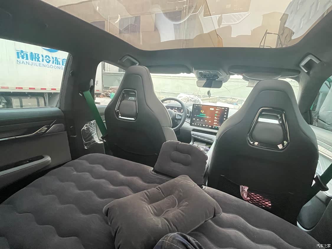 极氪的大尺寸就保证了内部空间绝对够大,后排空间很大,我1米75的身高,前排驾驶位调节好的情况下,坐在后排头部空间至少有一拳的位置,腿部空间的话三四拳、甚至五拳的位置,后排甚至可以在放一张气垫床,其空间提供一个成年人平躺睡觉都毫无压力,当然还可以如官方图所示,放倒后排座椅铺一张更大的气垫床,可供两个成年人平躺无压力。